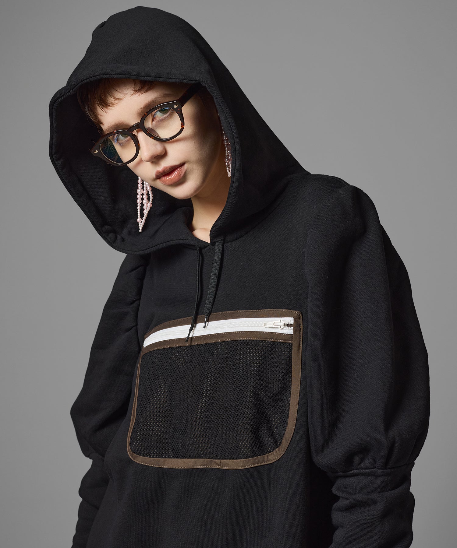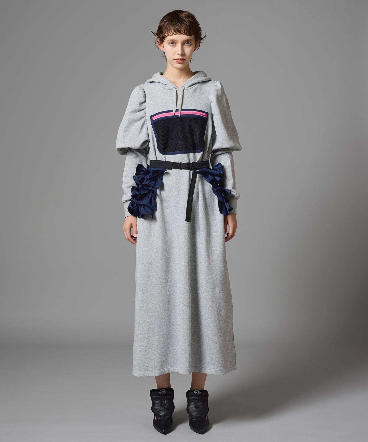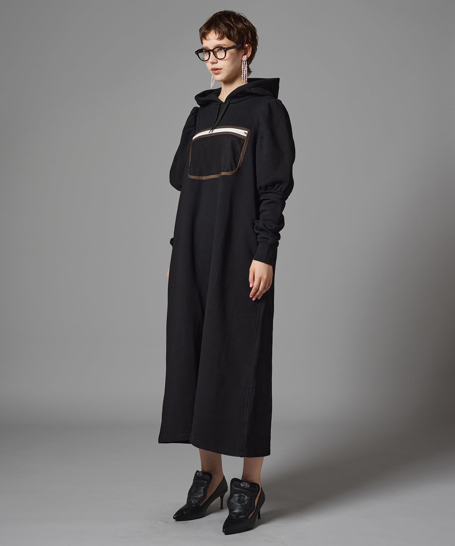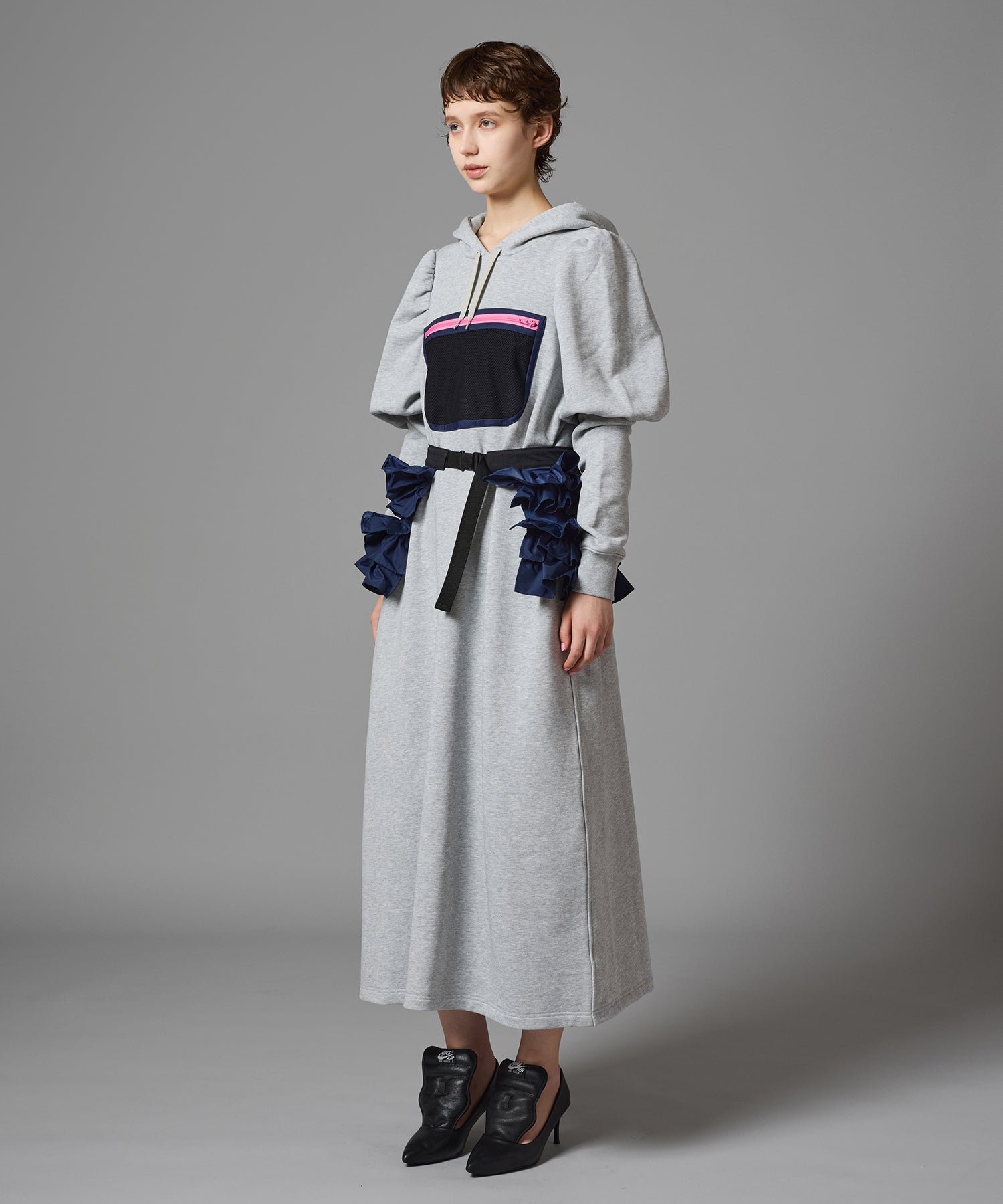 メッシュポケットが付いたプルオーバーパーカーワンピース。