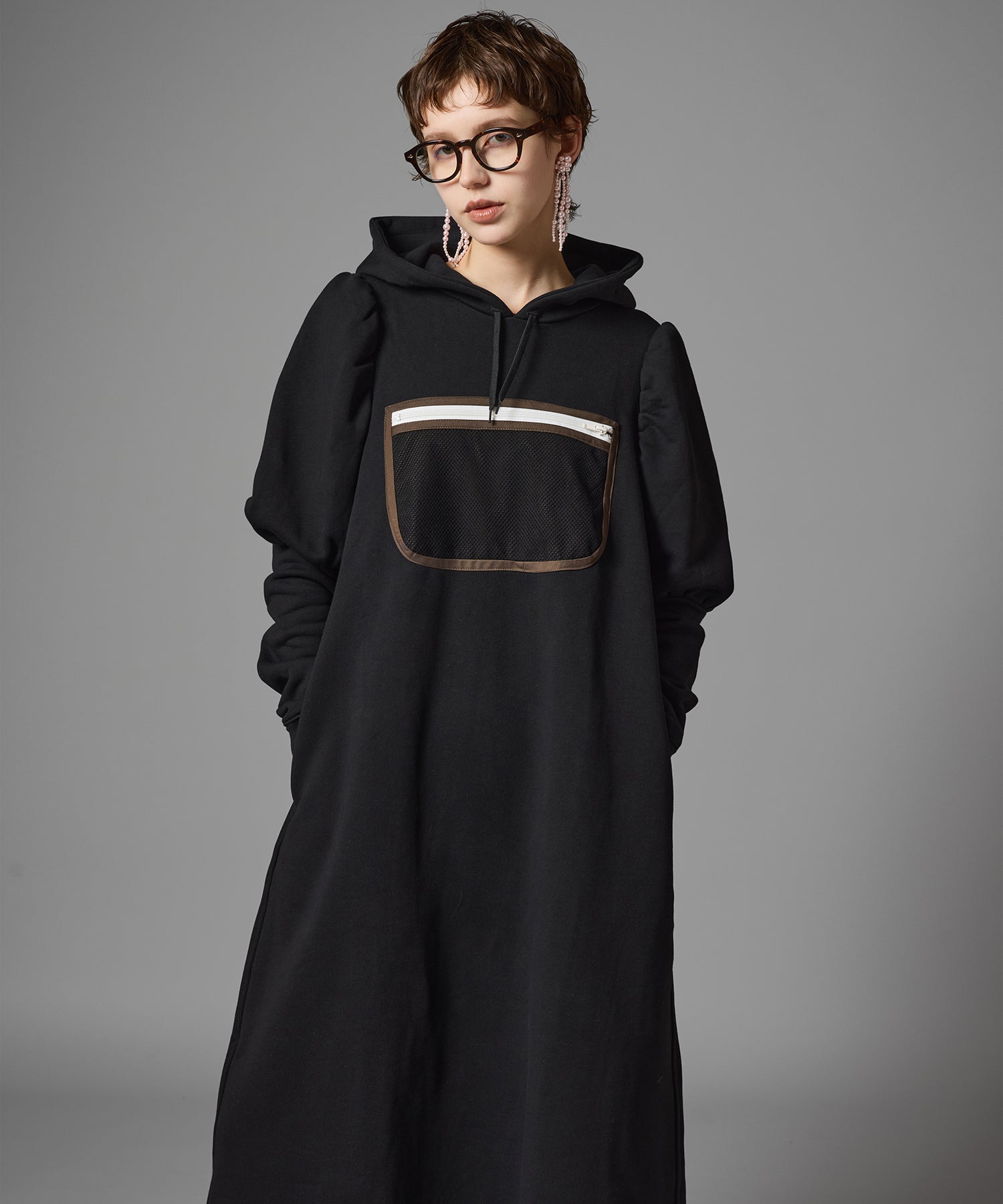 メッシュポケットが付いたプルオーバーパーカーワンピース。