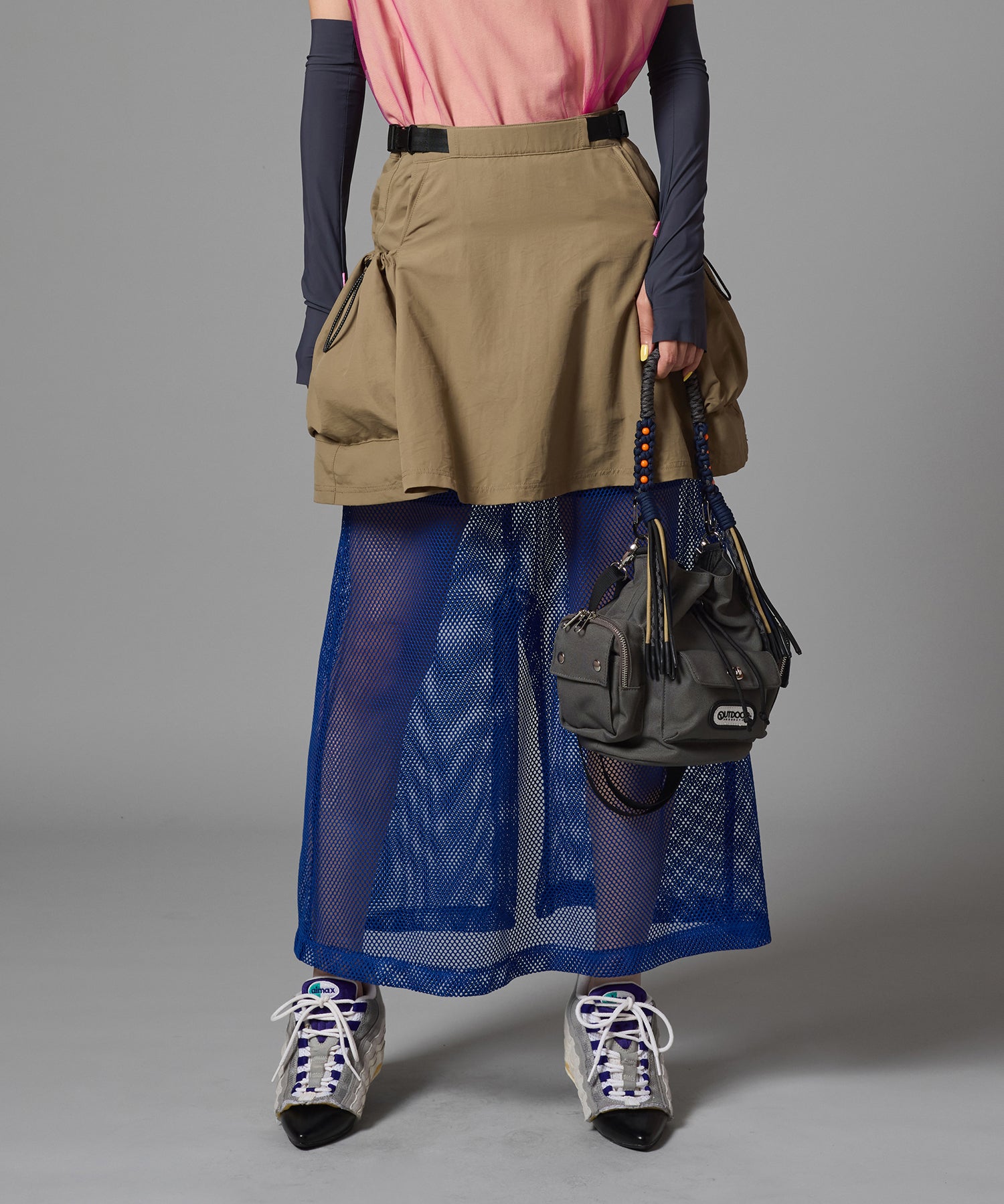 メッシュのライナーがレイヤーされたナイロンスカート。