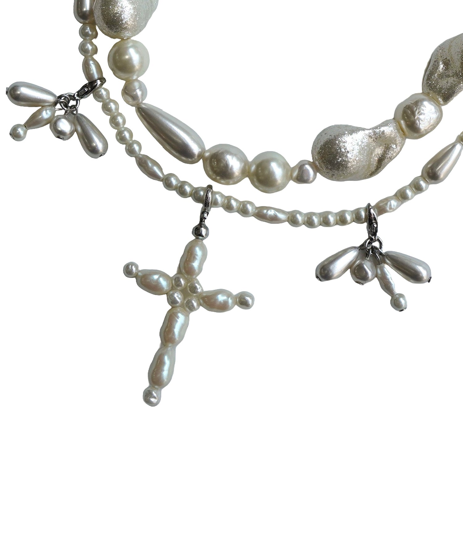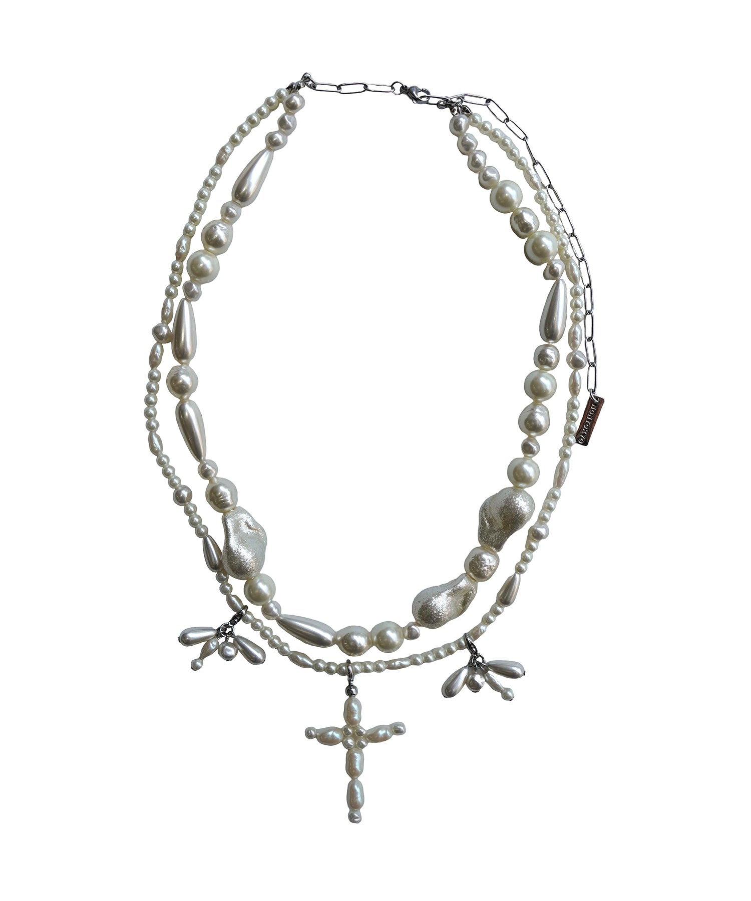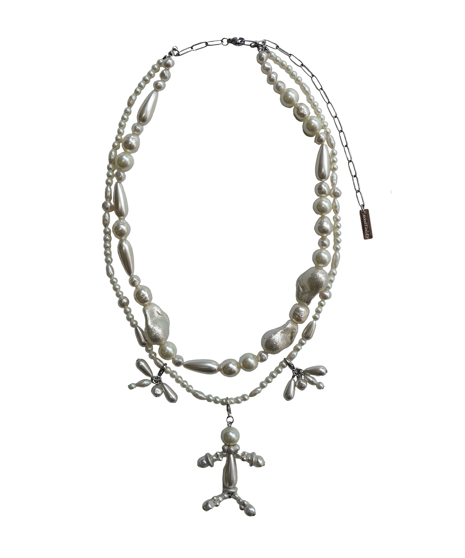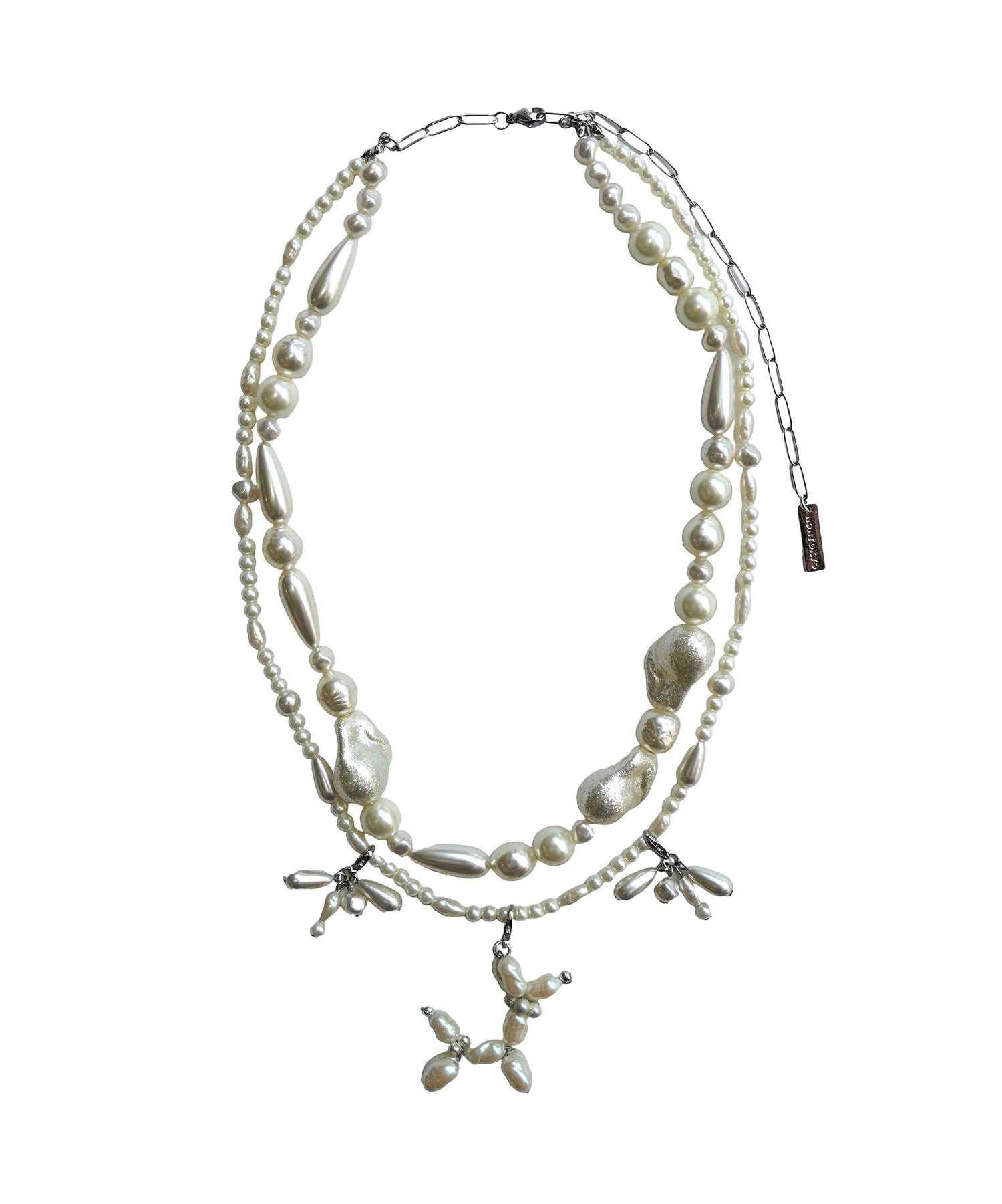 大小さまざまな形のガラスパールを贅沢に使用したレイヤードネックレス。