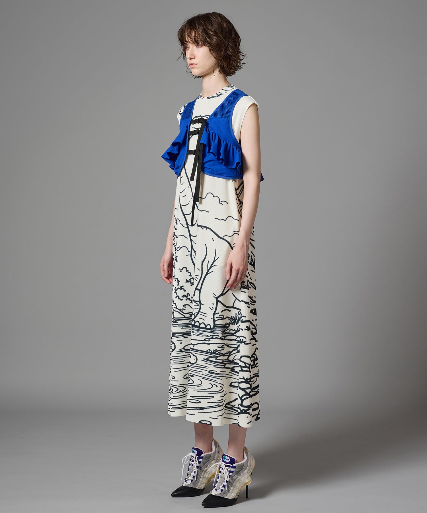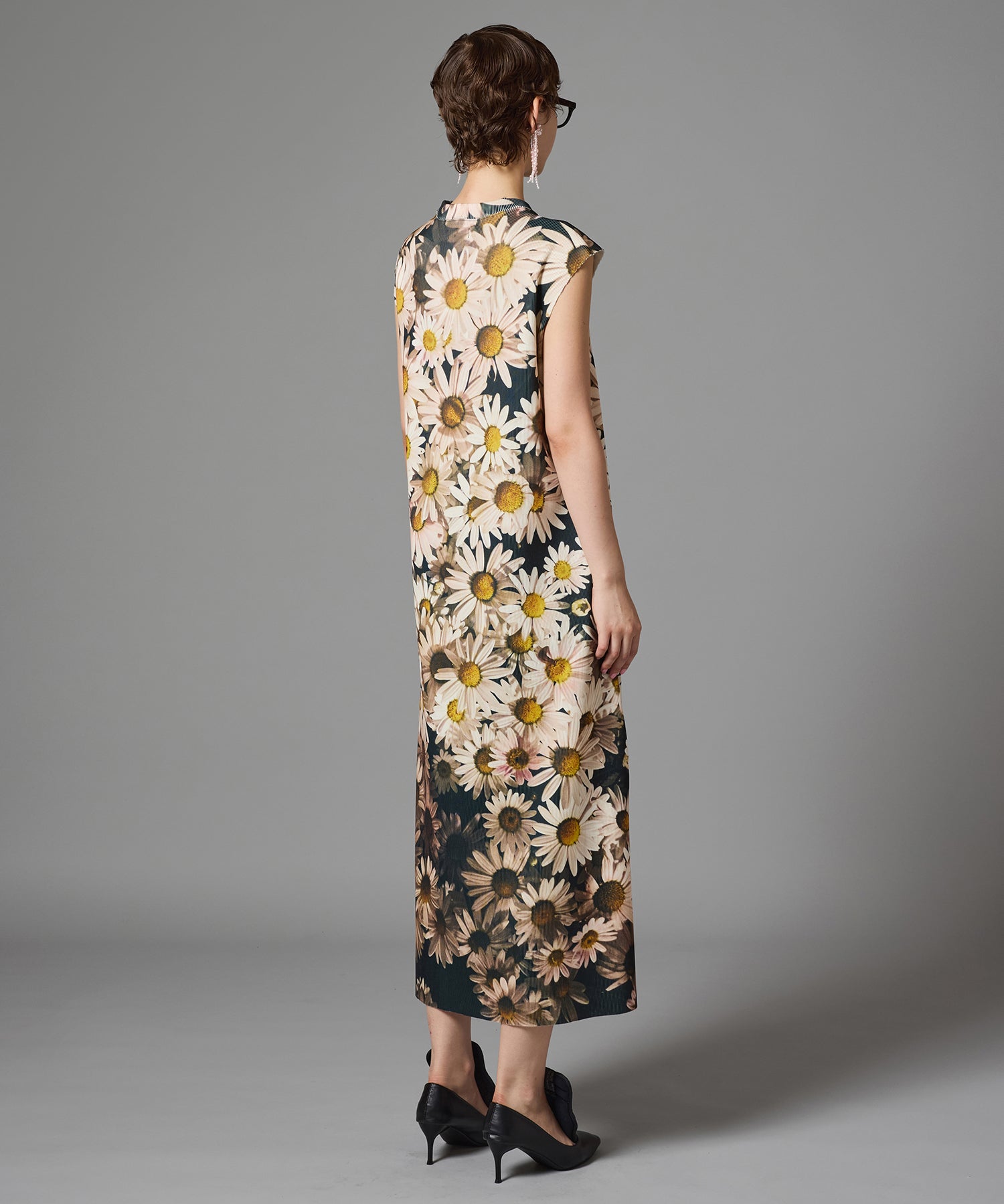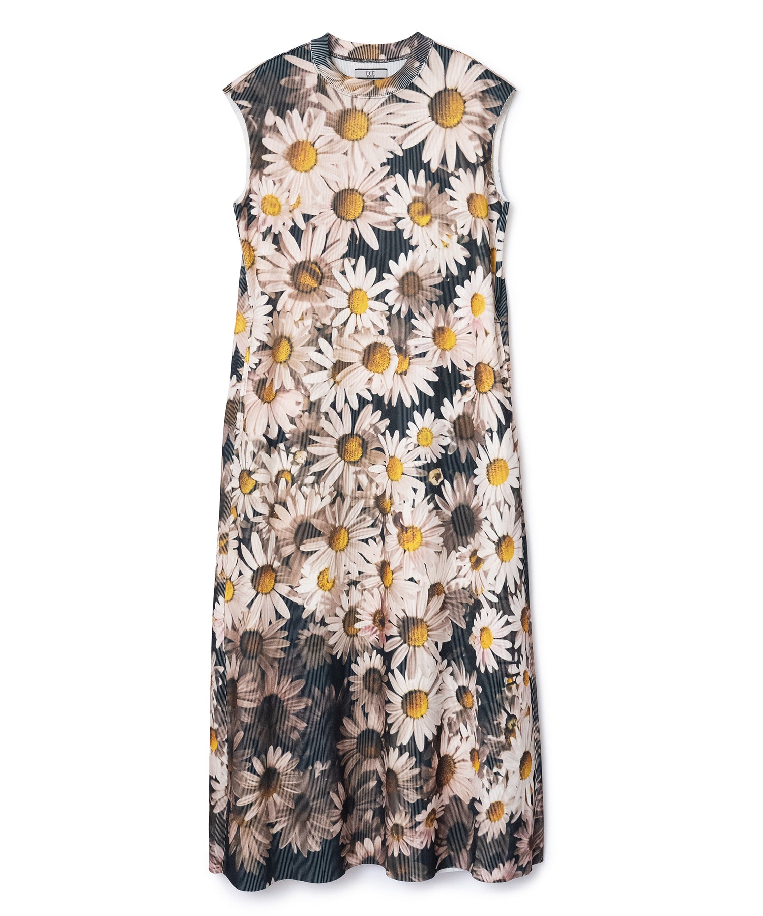 ハリとコシのあるリブを使用したクルーネックのノースリーブプリントワンピース。