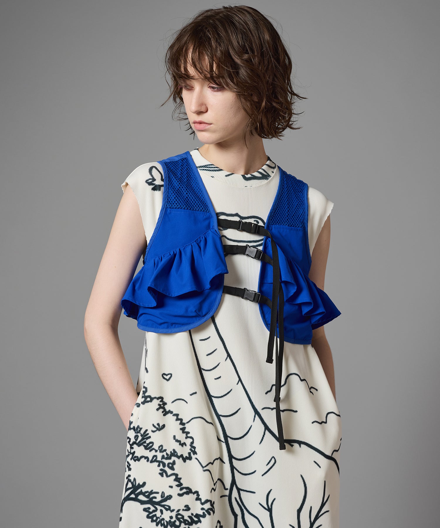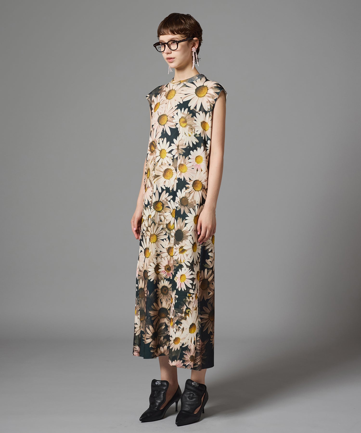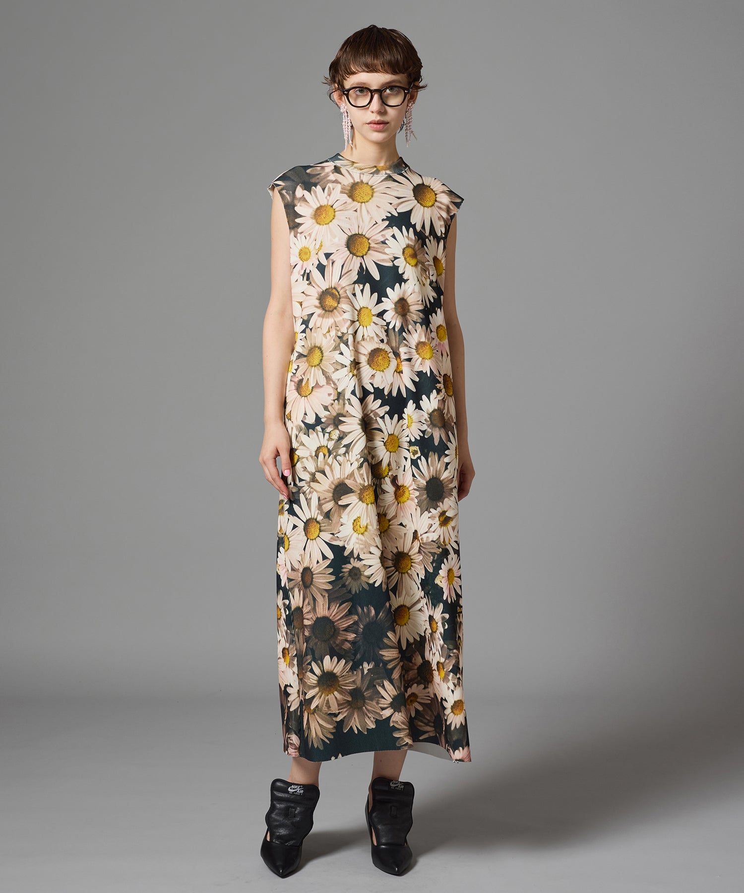 ハリとコシのあるリブを使用したクルーネックのノースリーブプリントワンピース。