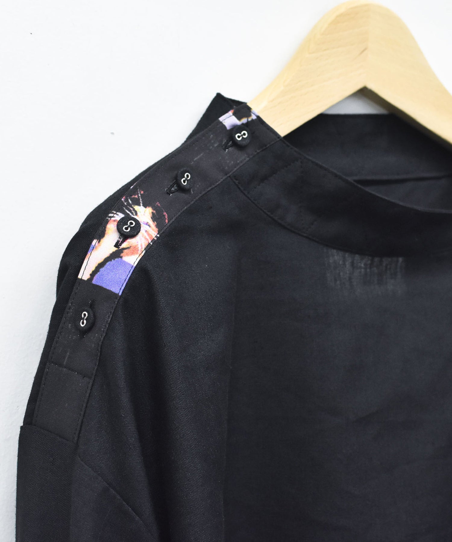右肩の開きにオリジナルのプリントファブリックがデザインアクセントのシンプルな一着。