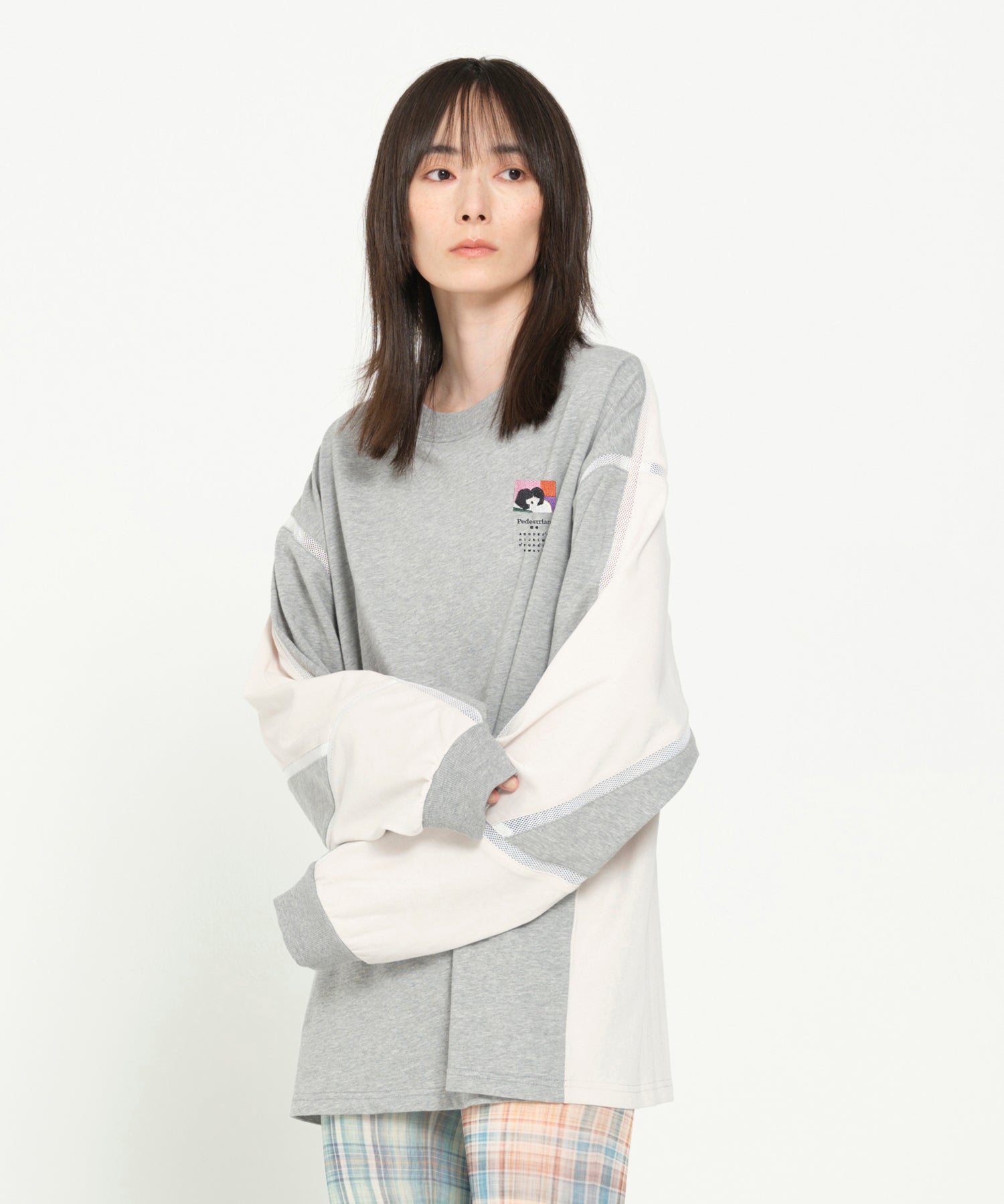 印象的な切り替えにメッシュを挟むことにより、独特の表情と長袖とは思えない涼やかな着心地を実現した配色プルオーバー。