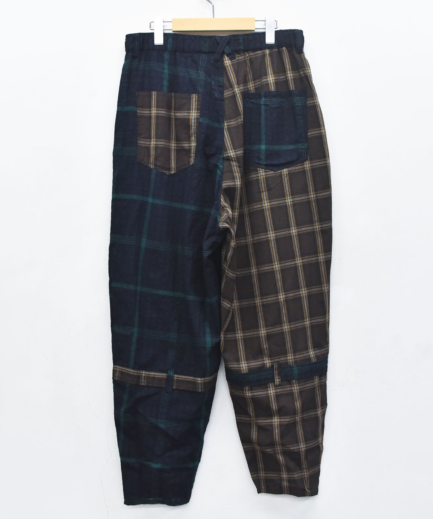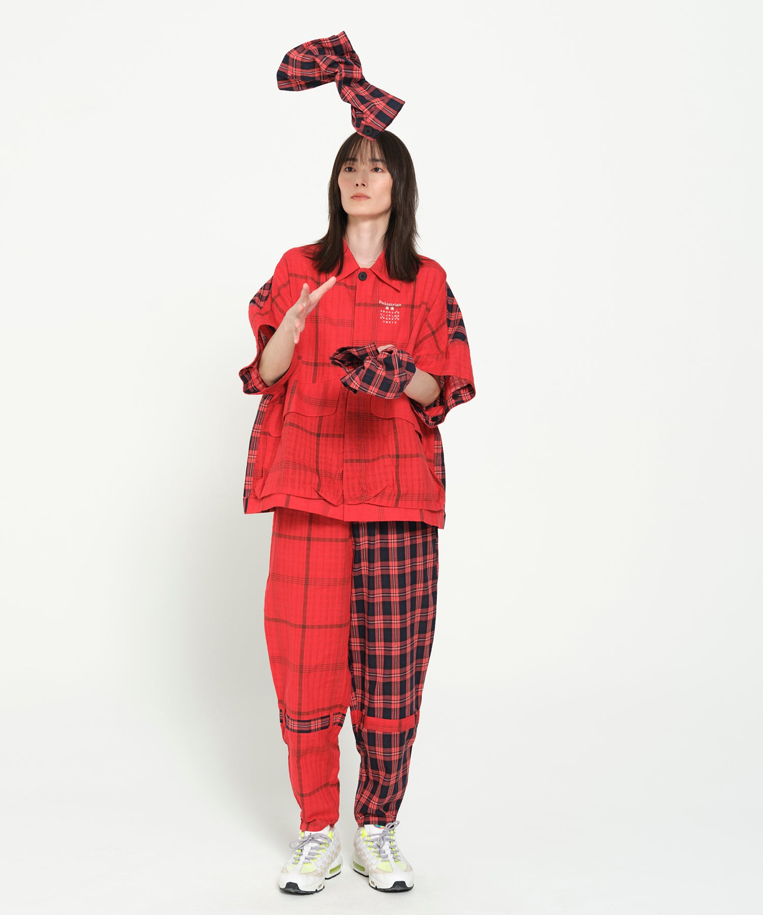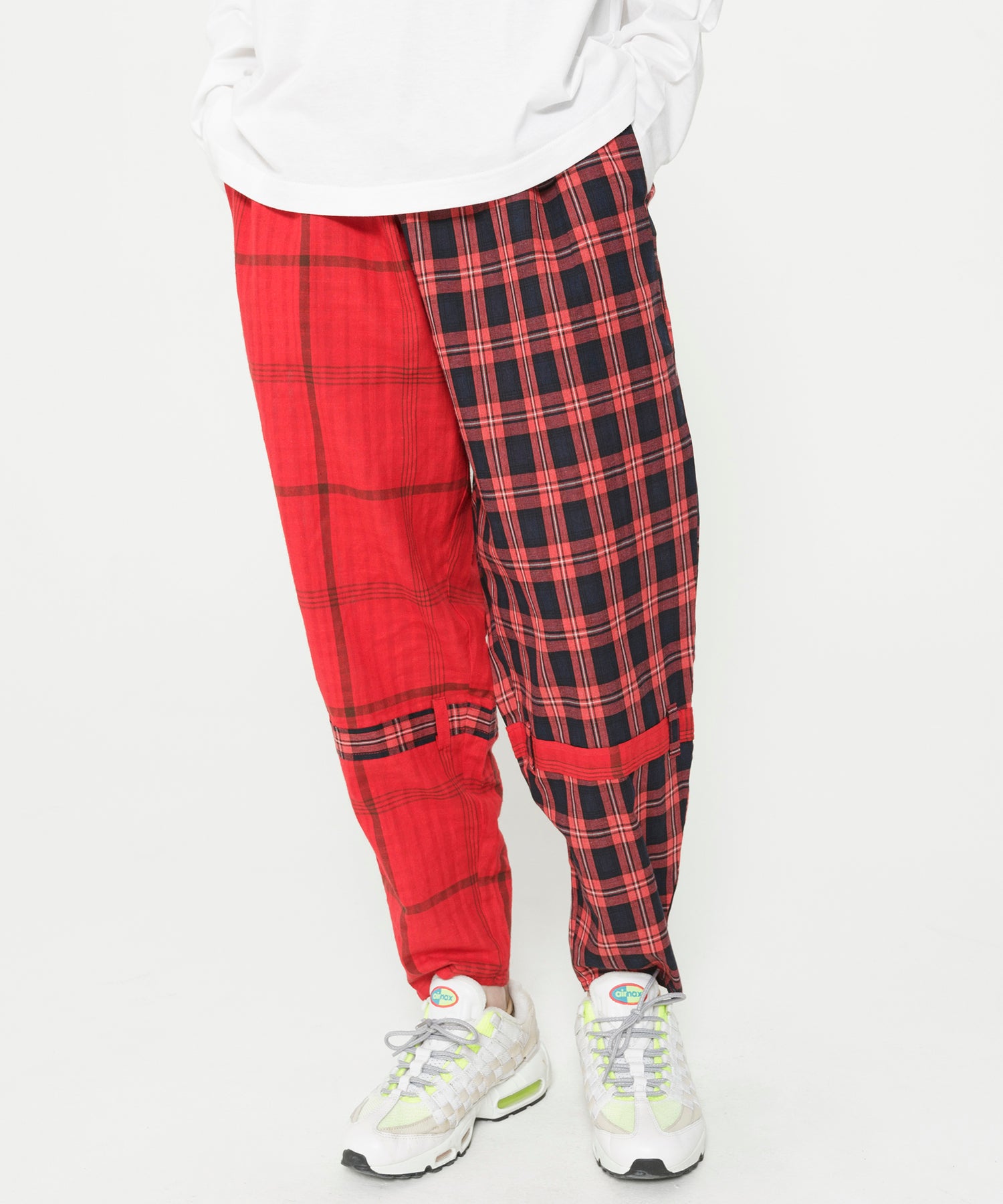 パンクテイストな2種類のチェックに、ボンテージパンツ風のディテールを閉じ込めました。