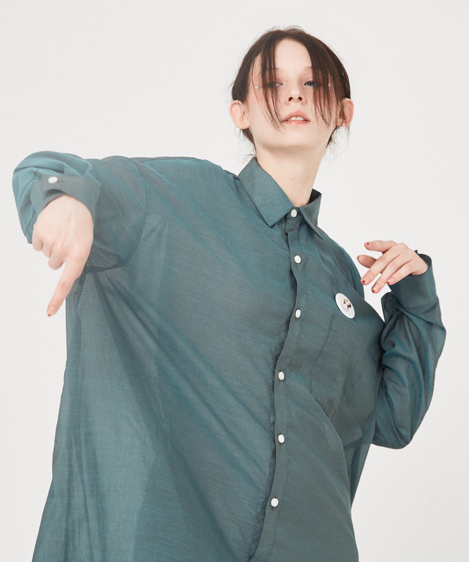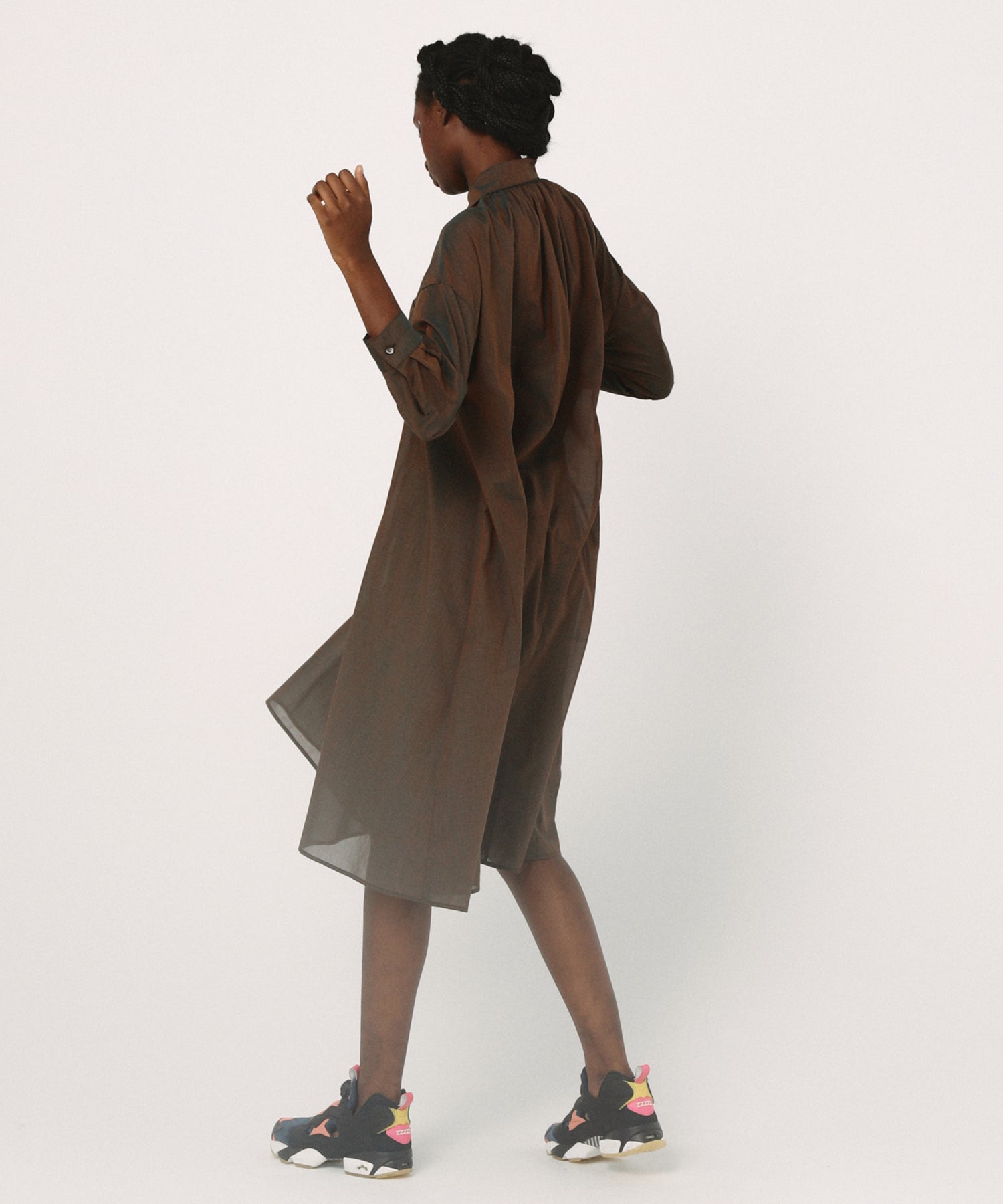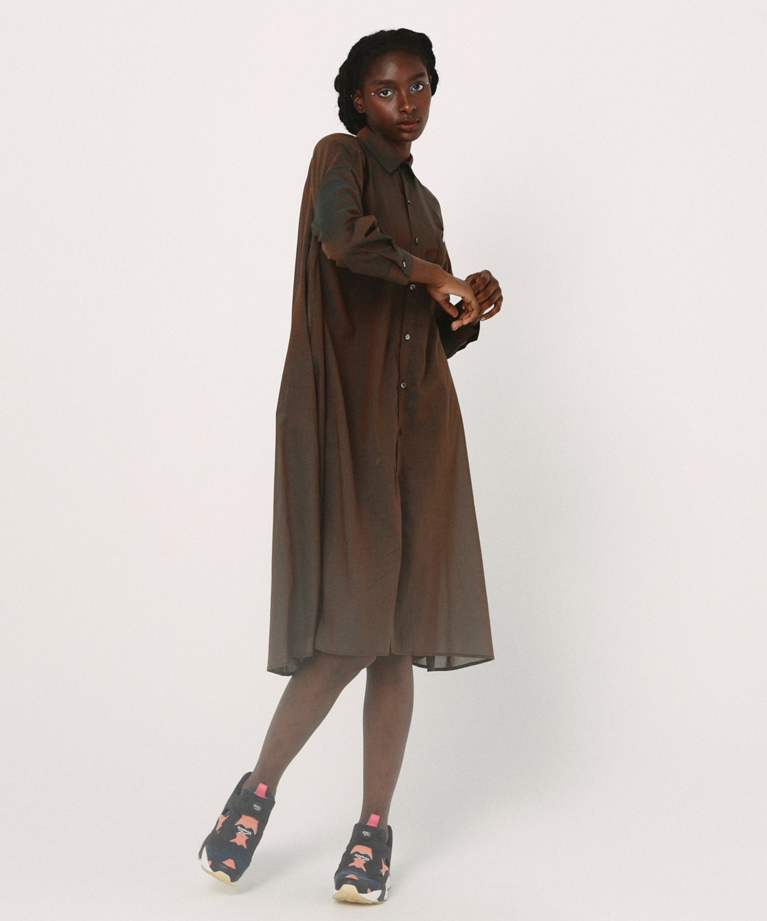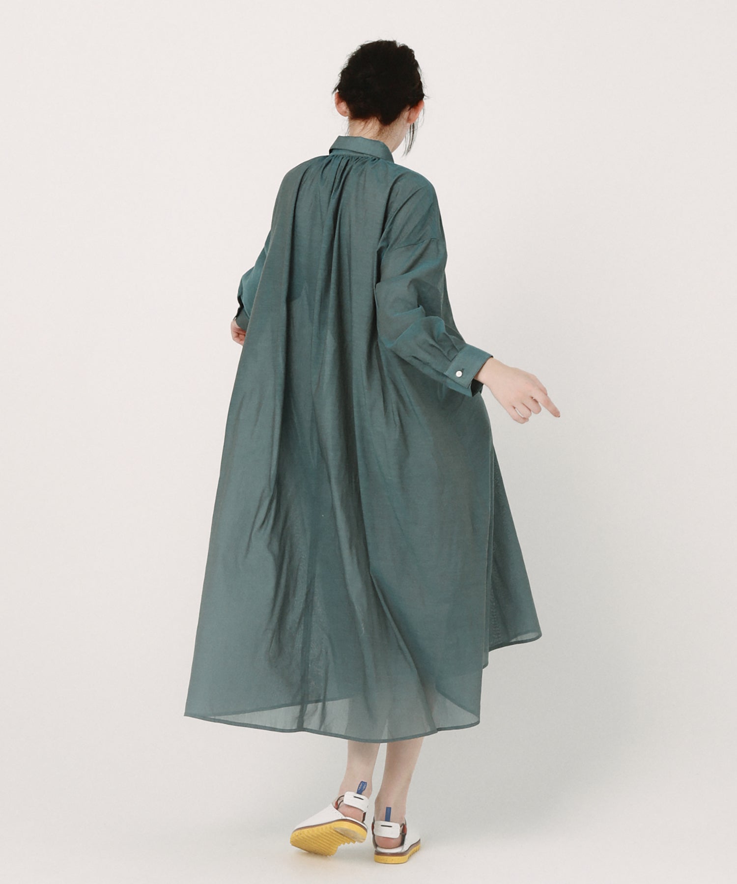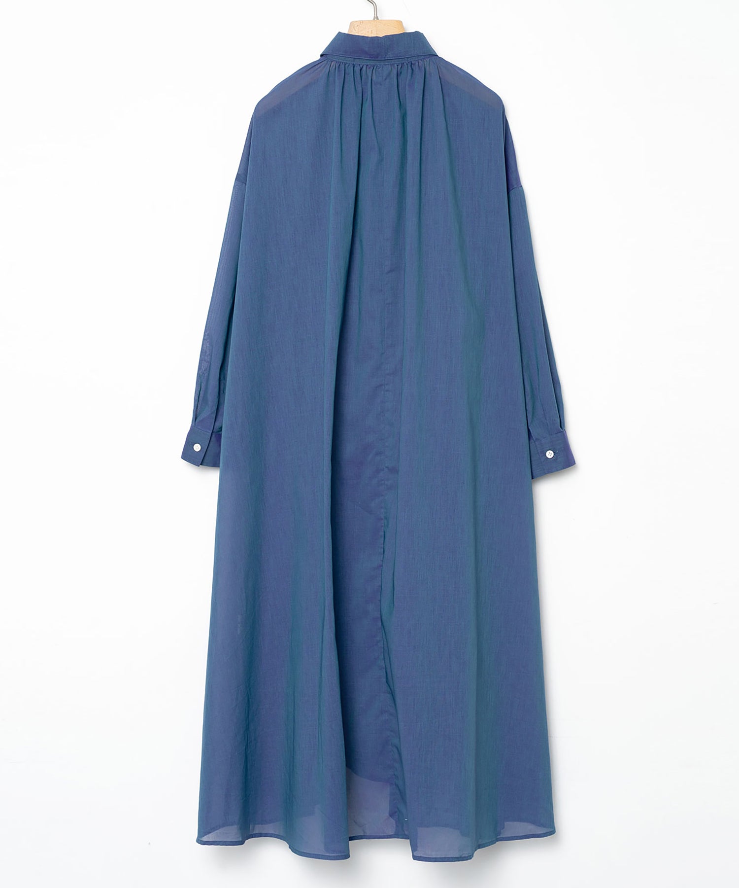 見る角度で色が変わって見える特殊な織り方をした生地を贅沢につかったシャツワンピース。