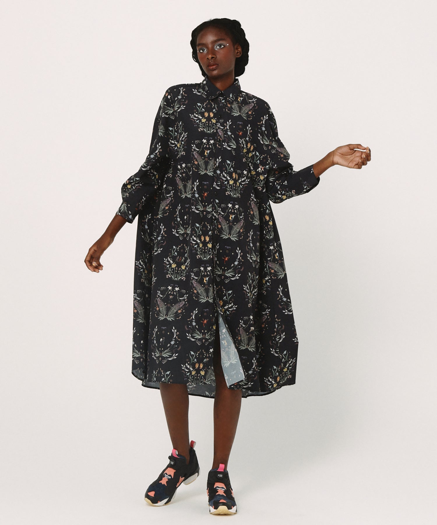 古今東西のダンスの名シーンを集結させたオリジナルのテキスタイルが魅力的なシャツワンピース。