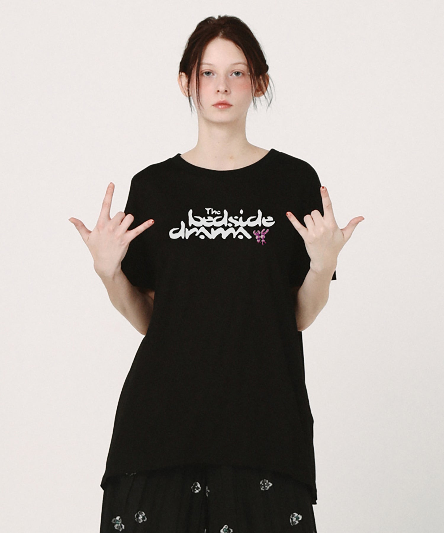雰囲気のあるロゴマークと舞い踊るピンクのキャラクターたちが印象的なプリントTee。