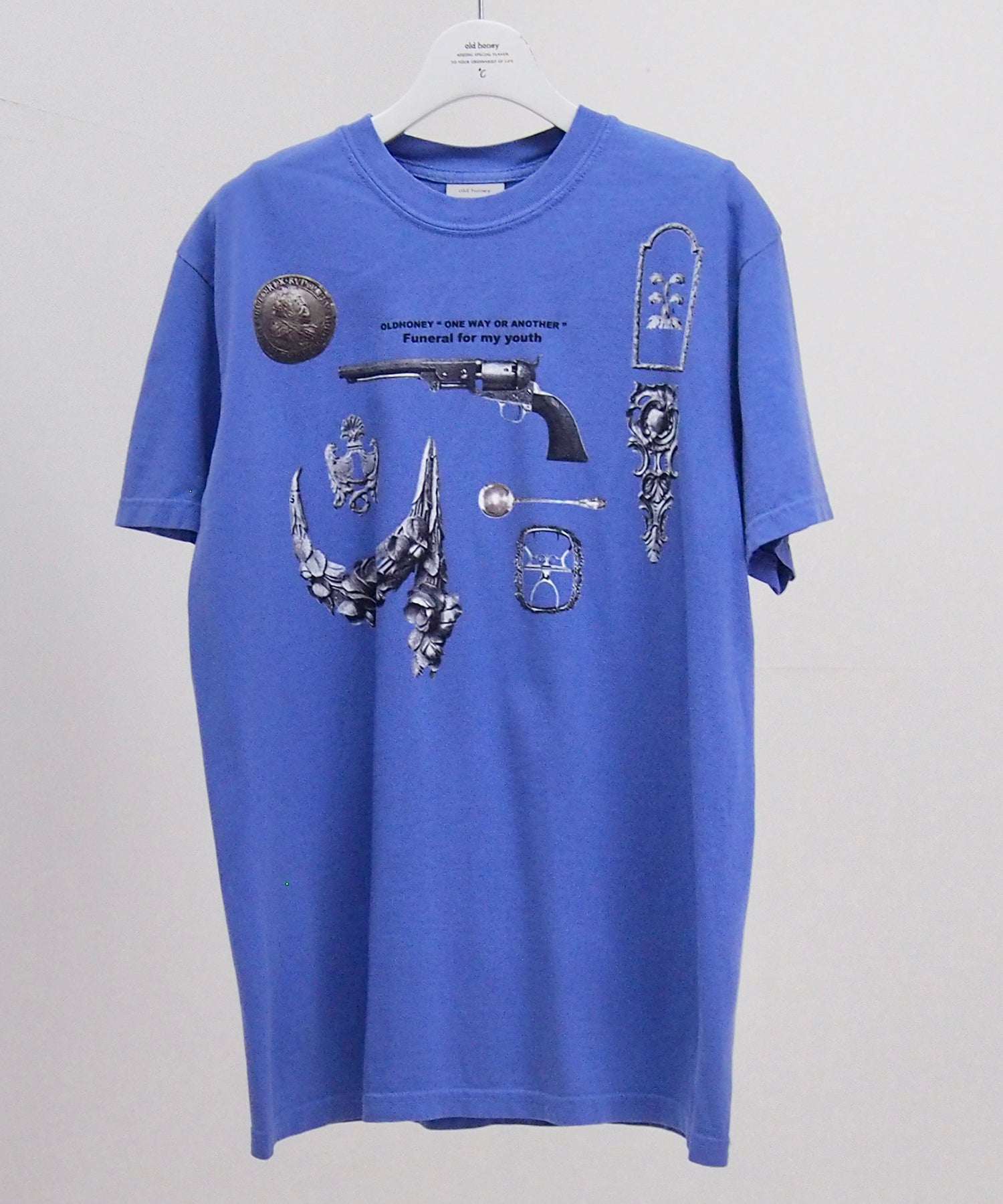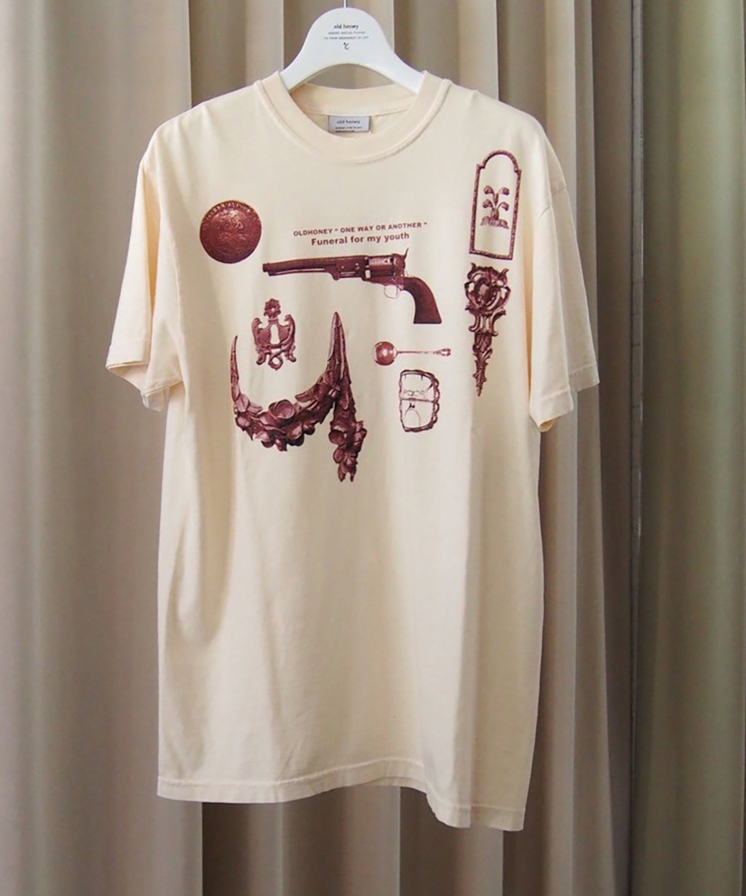 武装して強くなっていくインスピレーションから、様々なモチーフをコラージュをしたプリントTシャツ。Funeral for my youth (青春の葬式)と印字されています。