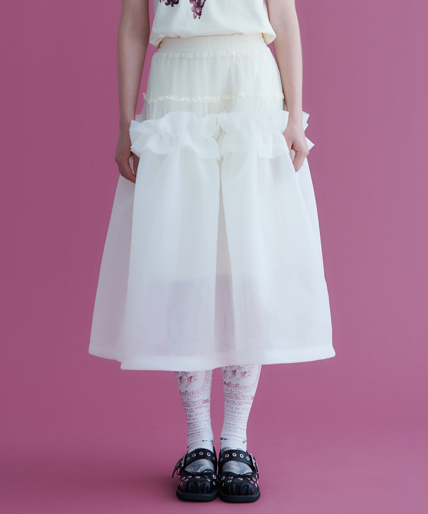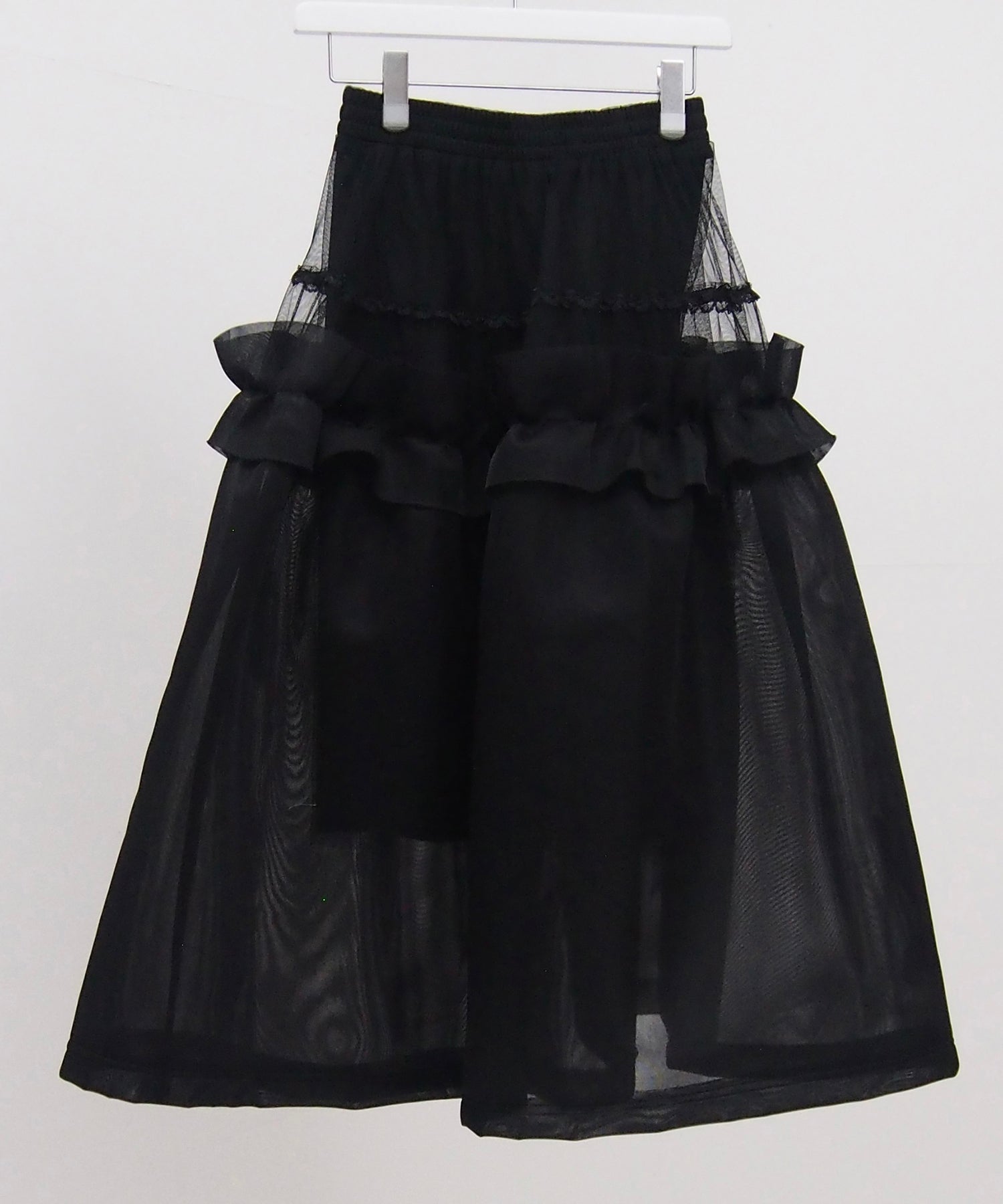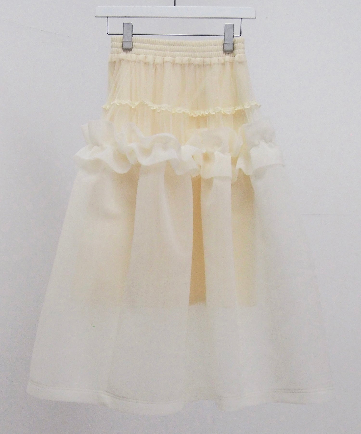 透け感のあるダンボールニットとチュール素材を使用したレイヤードスカート。ボリューム感のあるフォルム、フリルを装飾しつつも、シンプルモダンに。