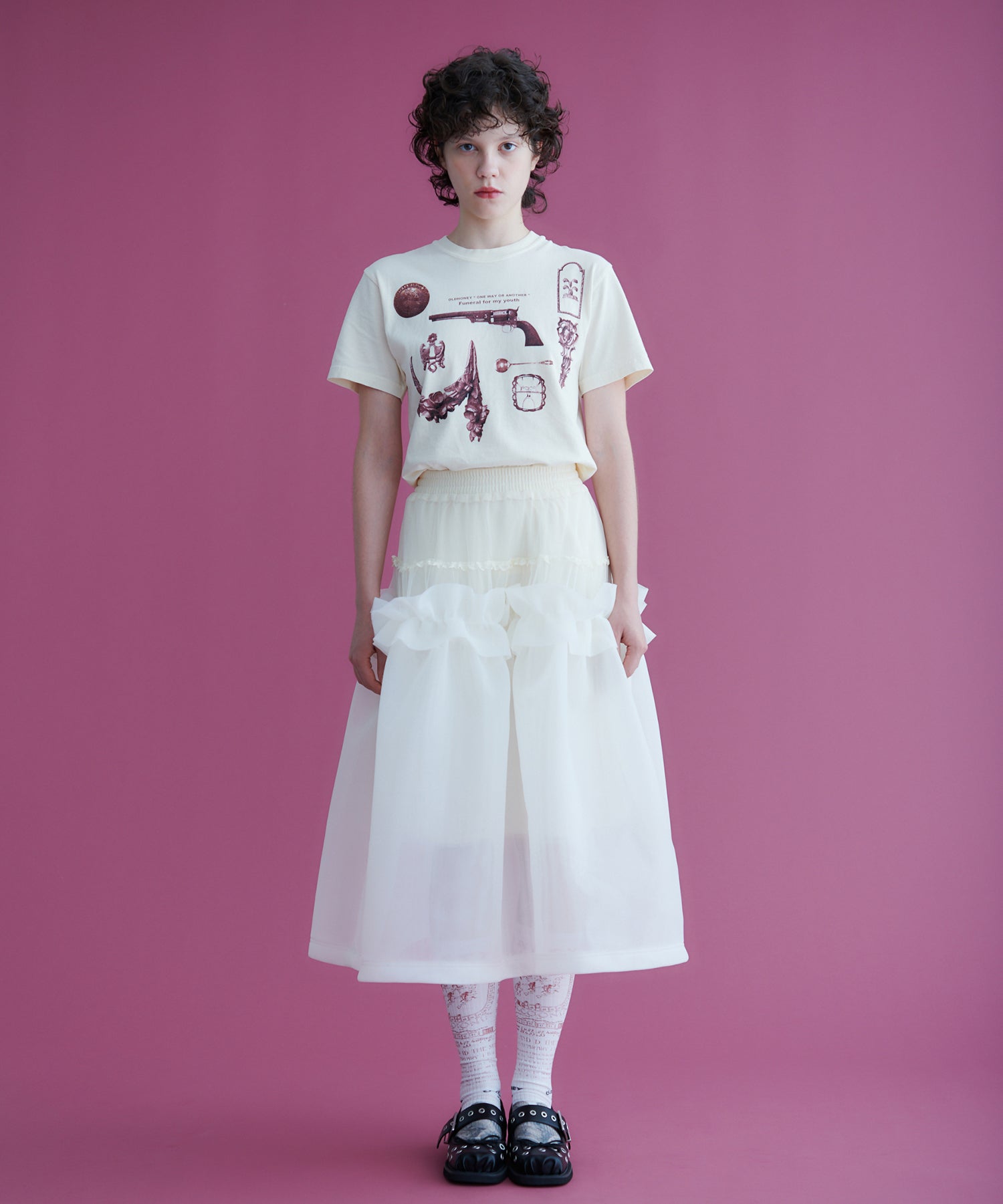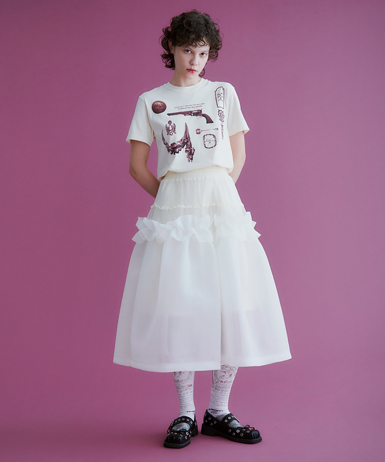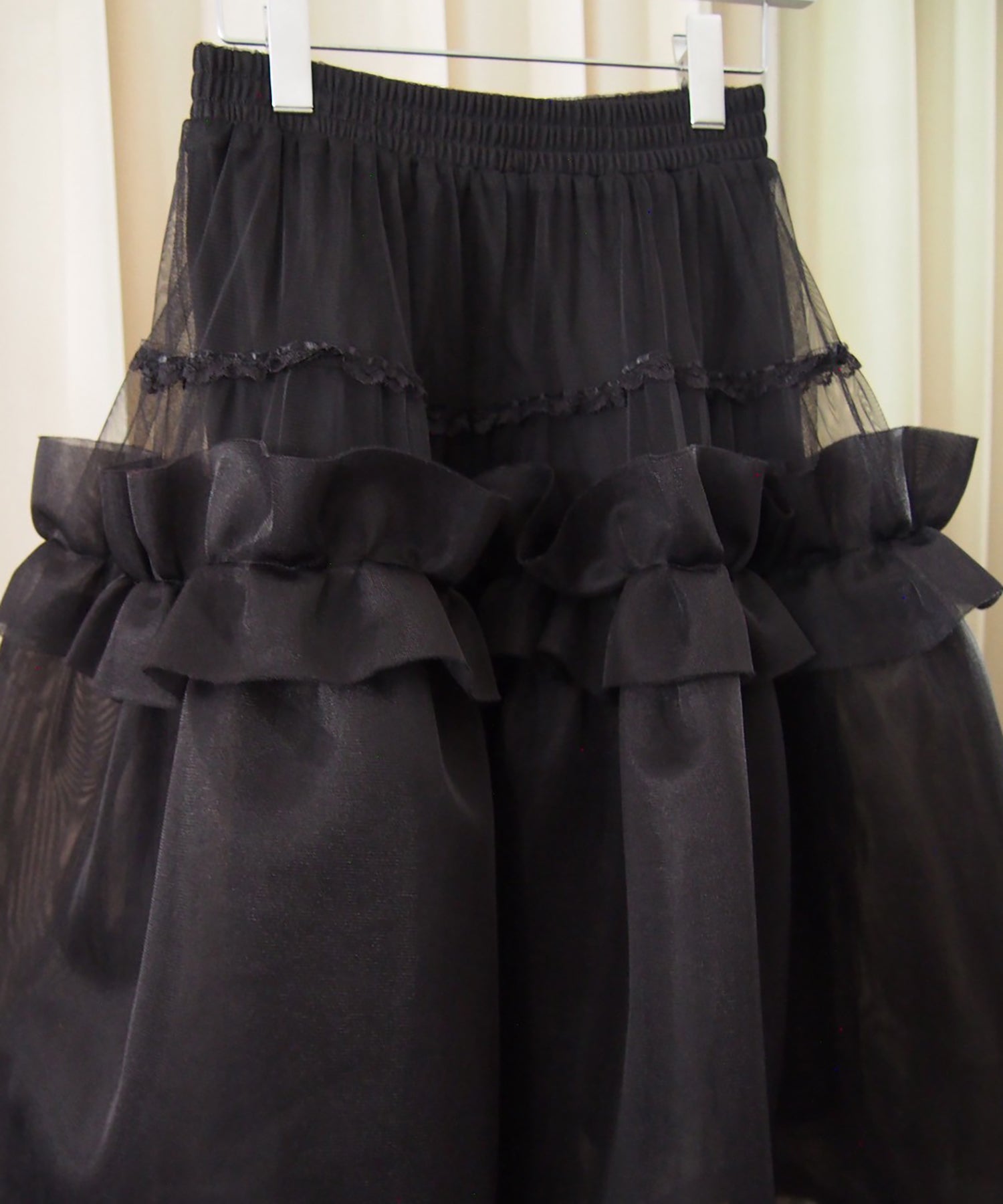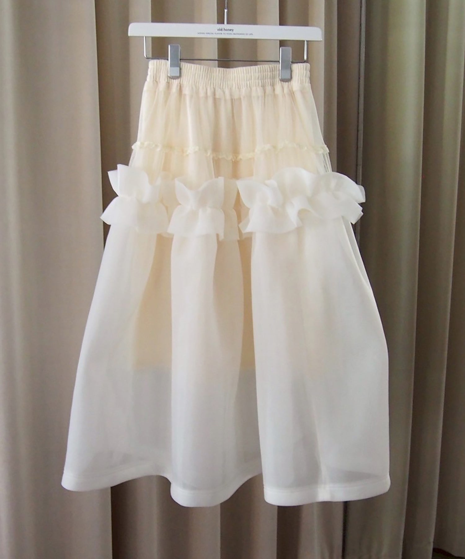 透け感のあるダンボールニットとチュール素材を使用したレイヤードスカート。ボリューム感のあるフォルム、フリルを装飾しつつも、シンプルモダンに。