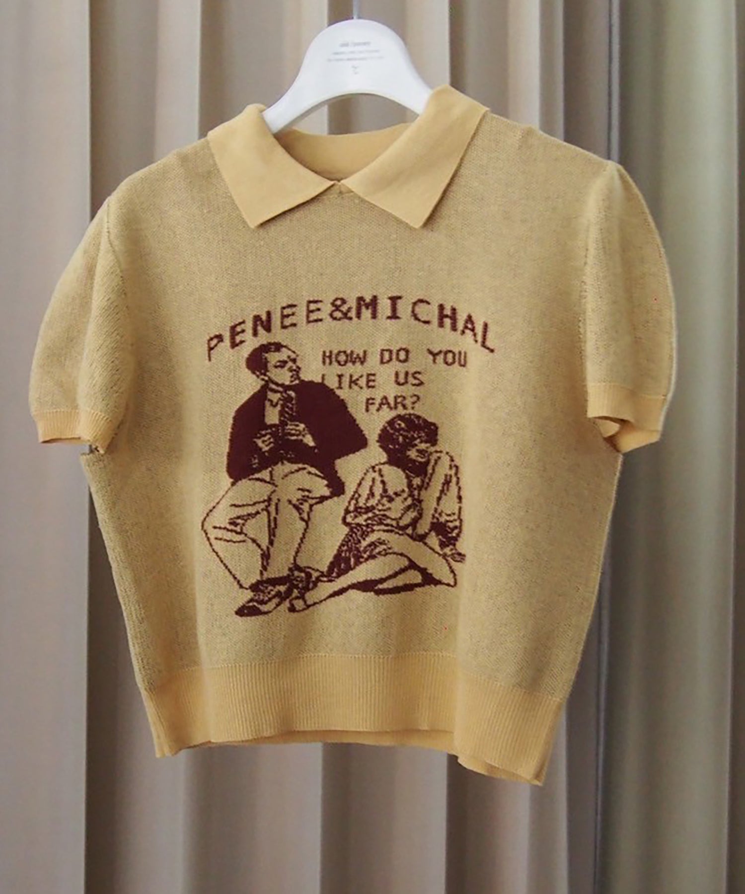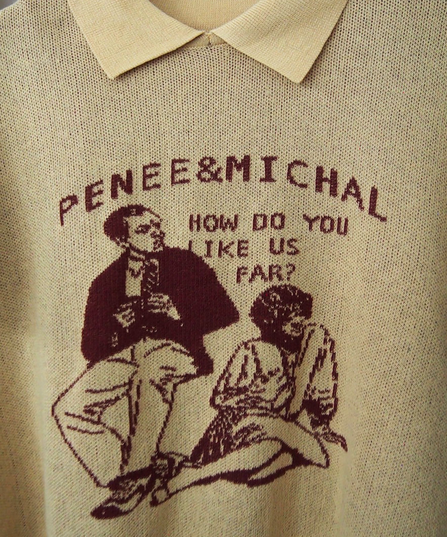 ニットに描かれたのは、海外の方がお祝いごとの際に自身の写真のプリントTシャツを作成するといった文化をもとに、架空の人物像を描きました。