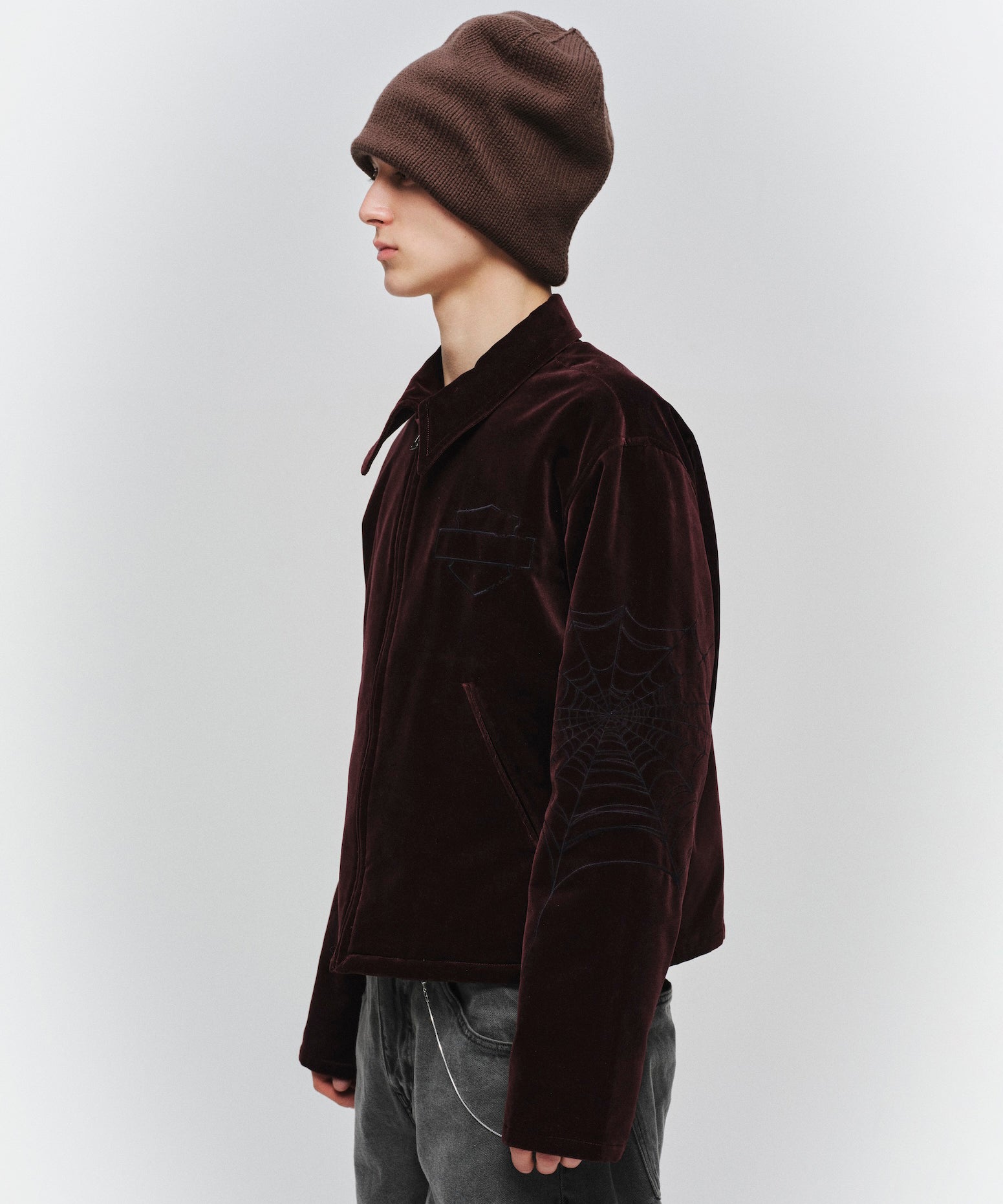 袖に施された蜘蛛モチーフの刺繍が印象的な、ショートジャケット。