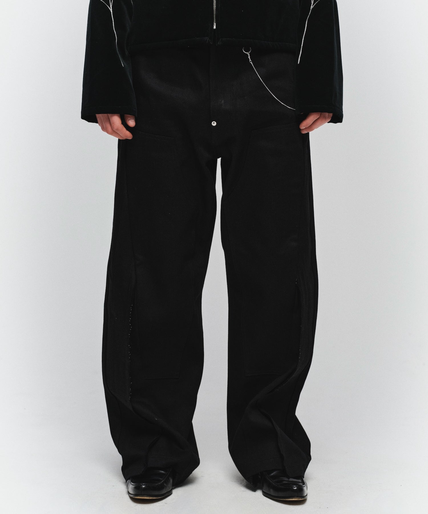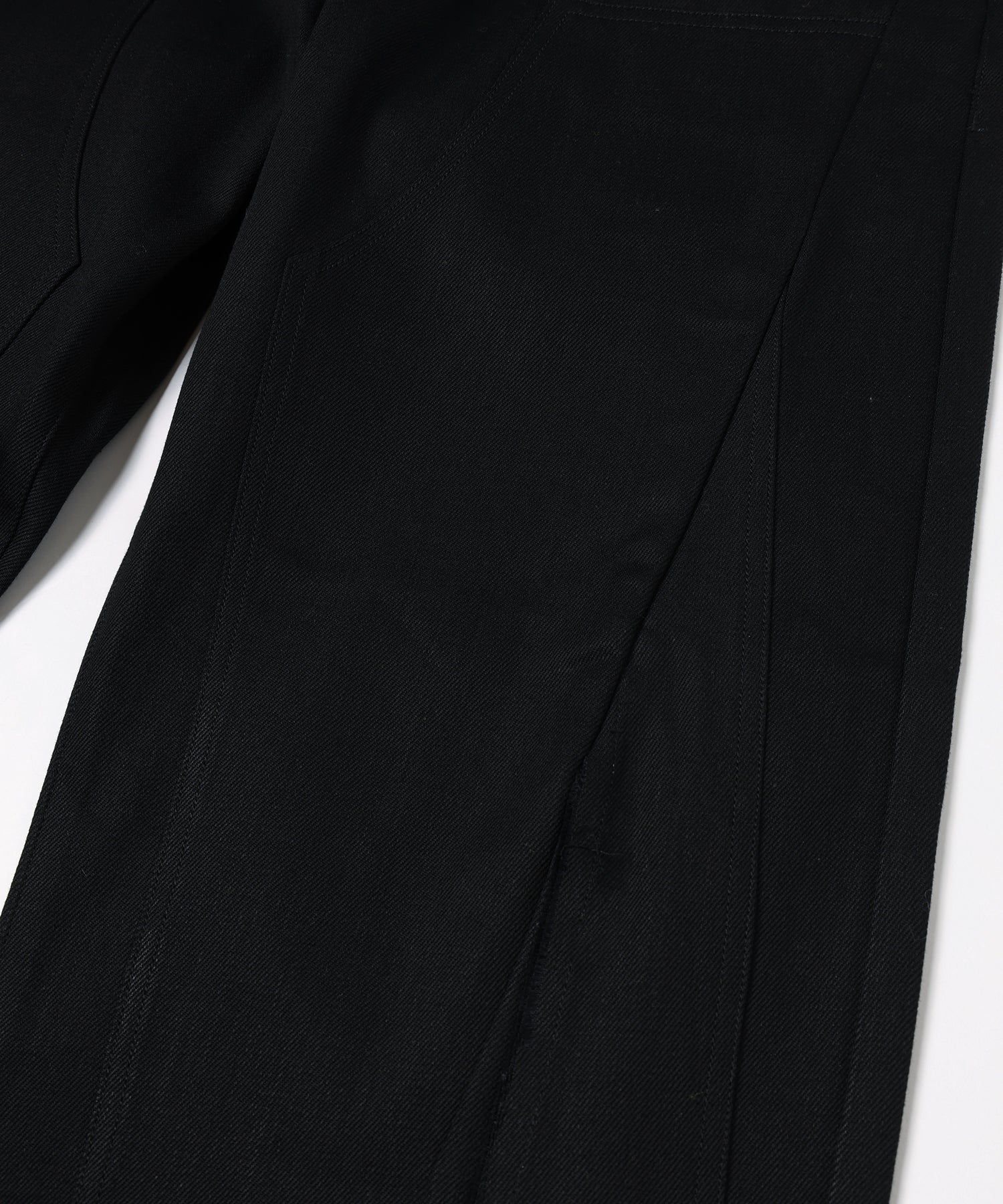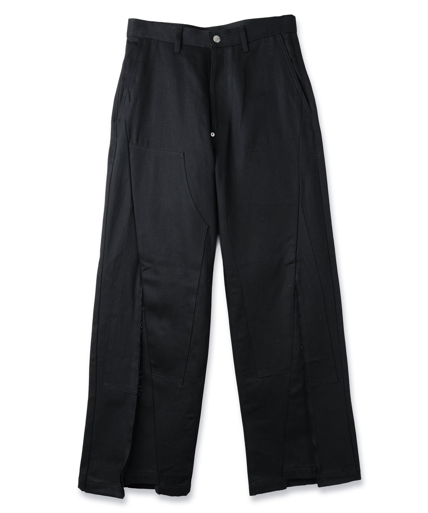 ダブルニーのデザインを再構築し、フロントからレッグラインにかけて走る切り替えが、立体的で存在感のある表情を生み出します。ワイドシルエットをベースに、サイドシームから裾にかけて緩やかなラインを描くことで、適度なボリュームを保ちながらも洗練されたバランスに仕上げています。