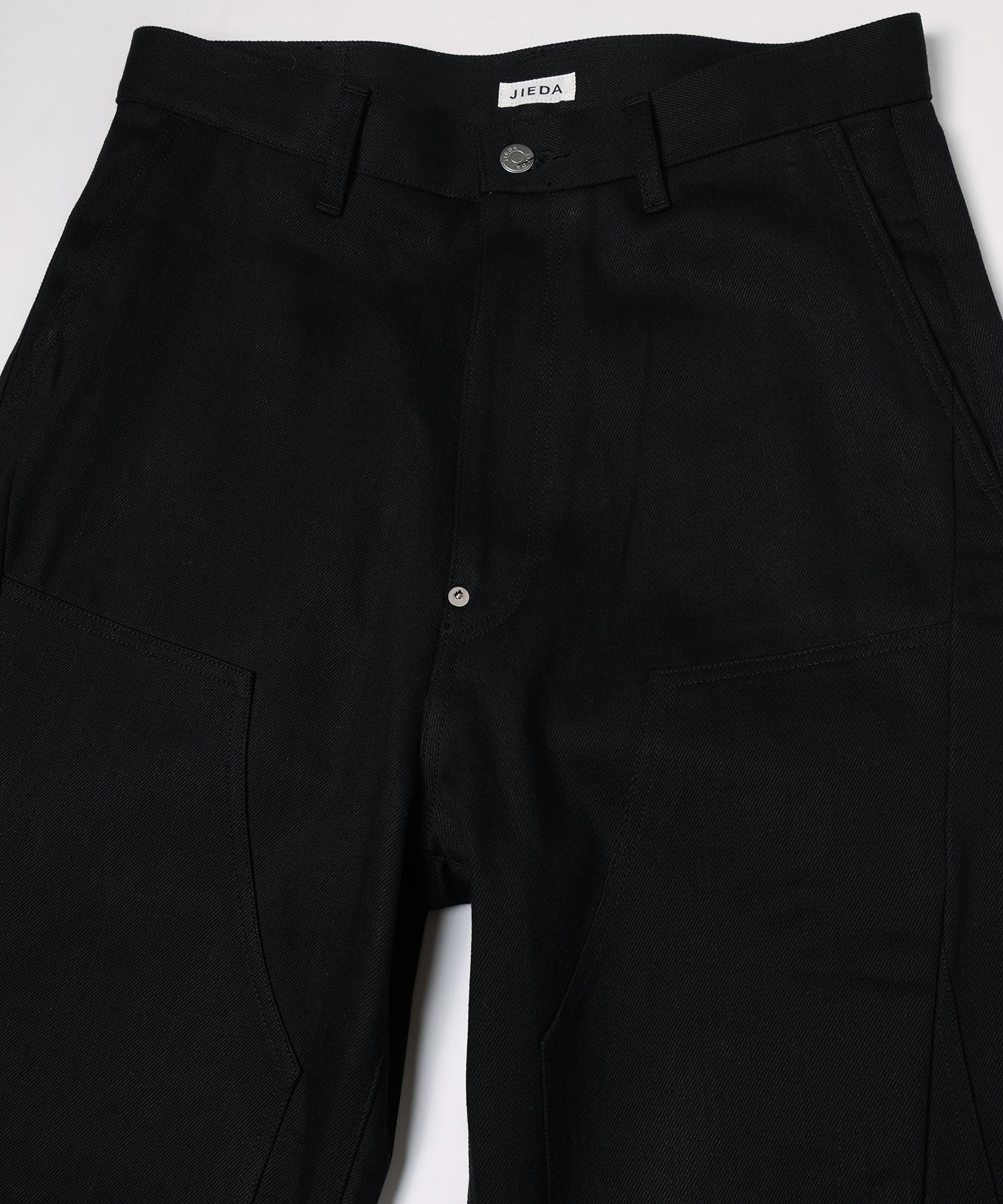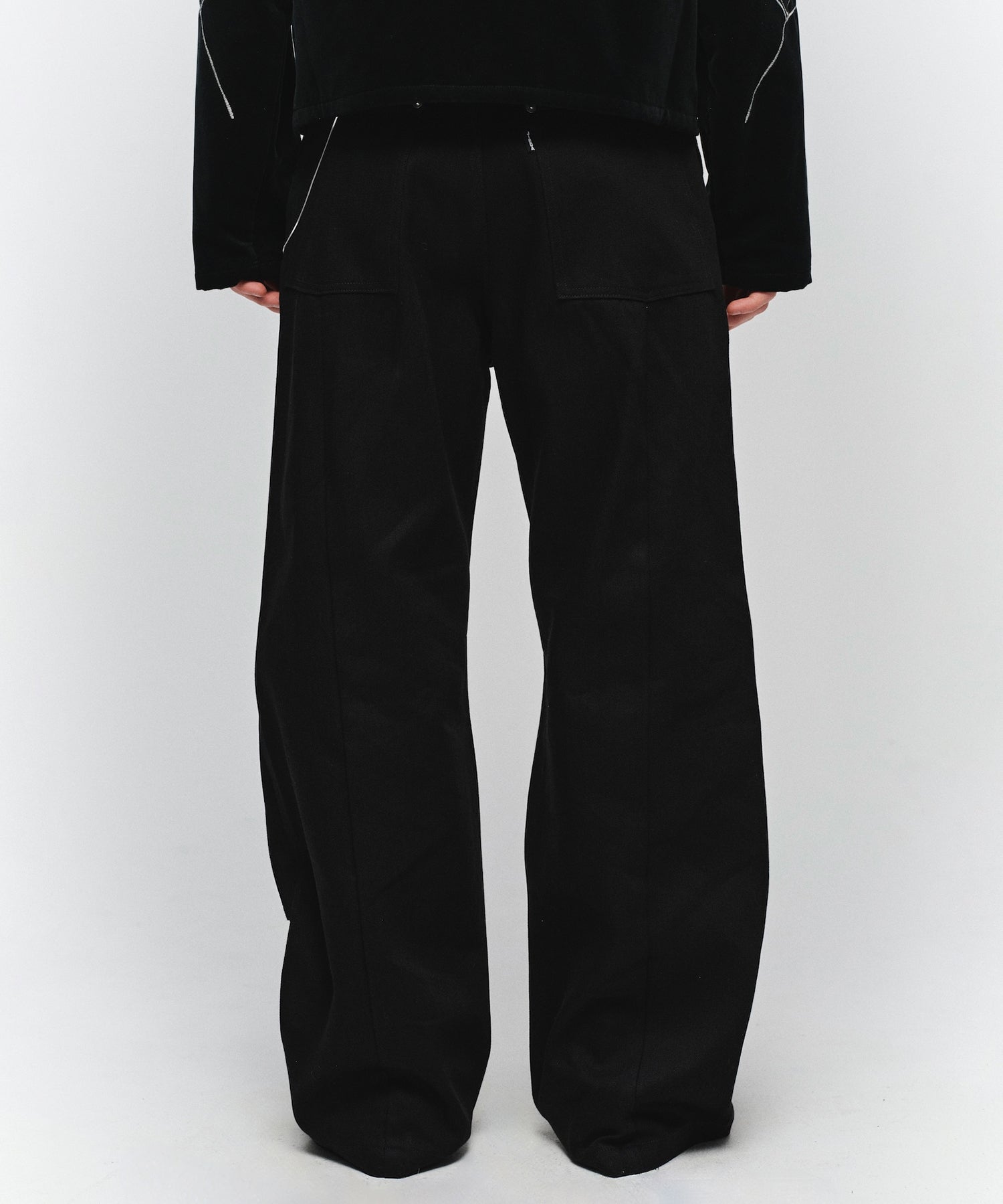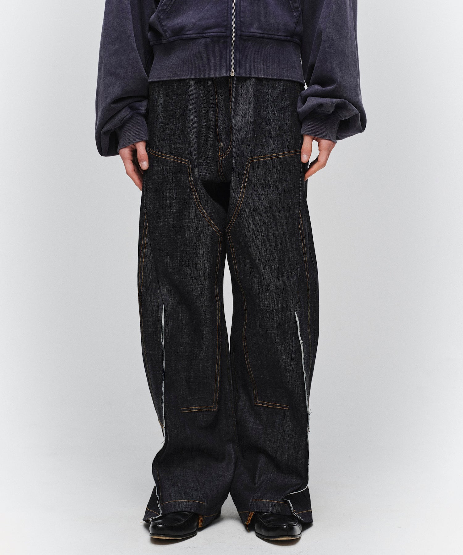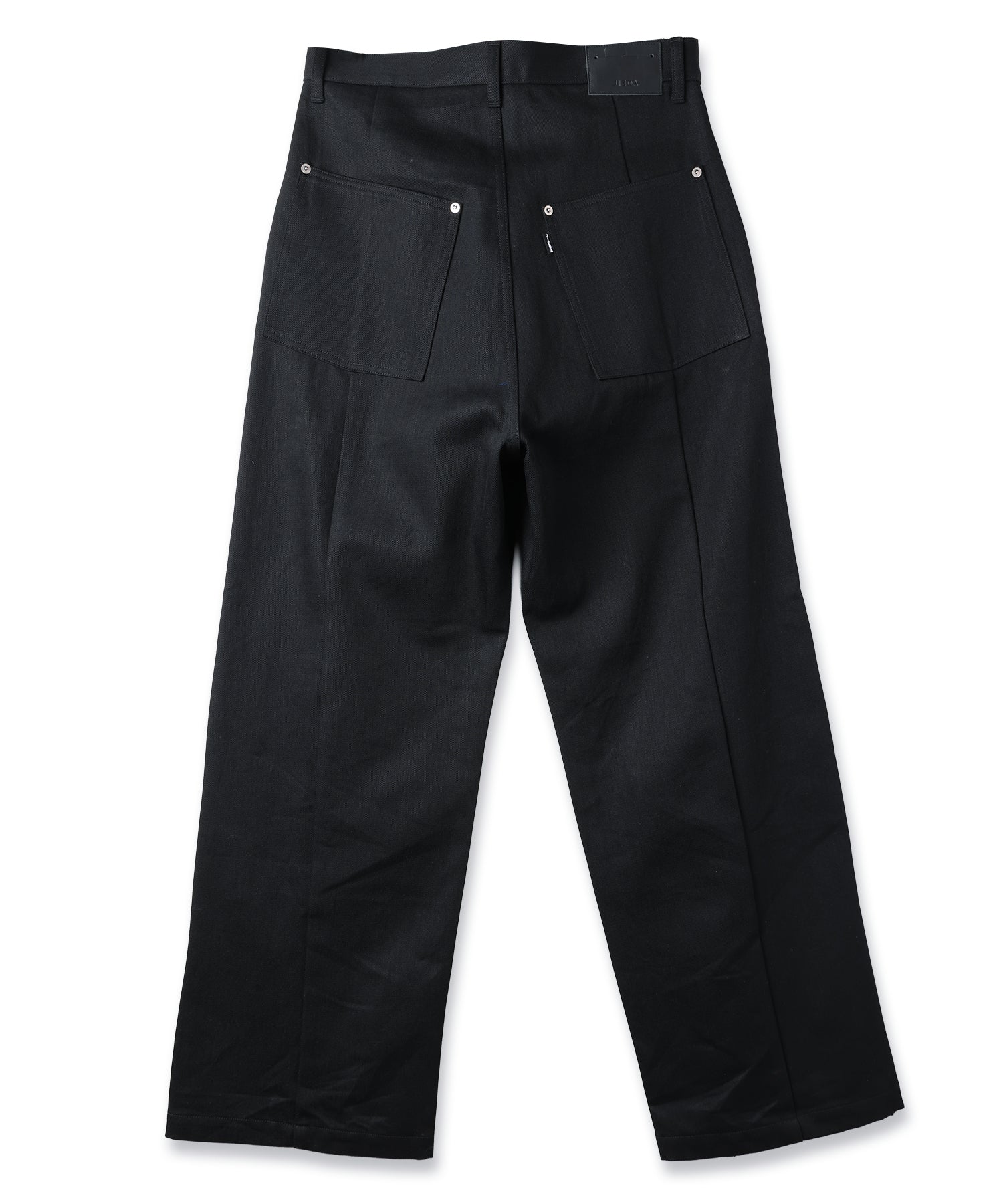 ダブルニーのデザインを再構築し、フロントからレッグラインにかけて走る切り替えが、立体的で存在感のある表情を生み出します。ワイドシルエットをベースに、サイドシームから裾にかけて緩やかなラインを描くことで、適度なボリュームを保ちながらも洗練されたバランスに仕上げています。