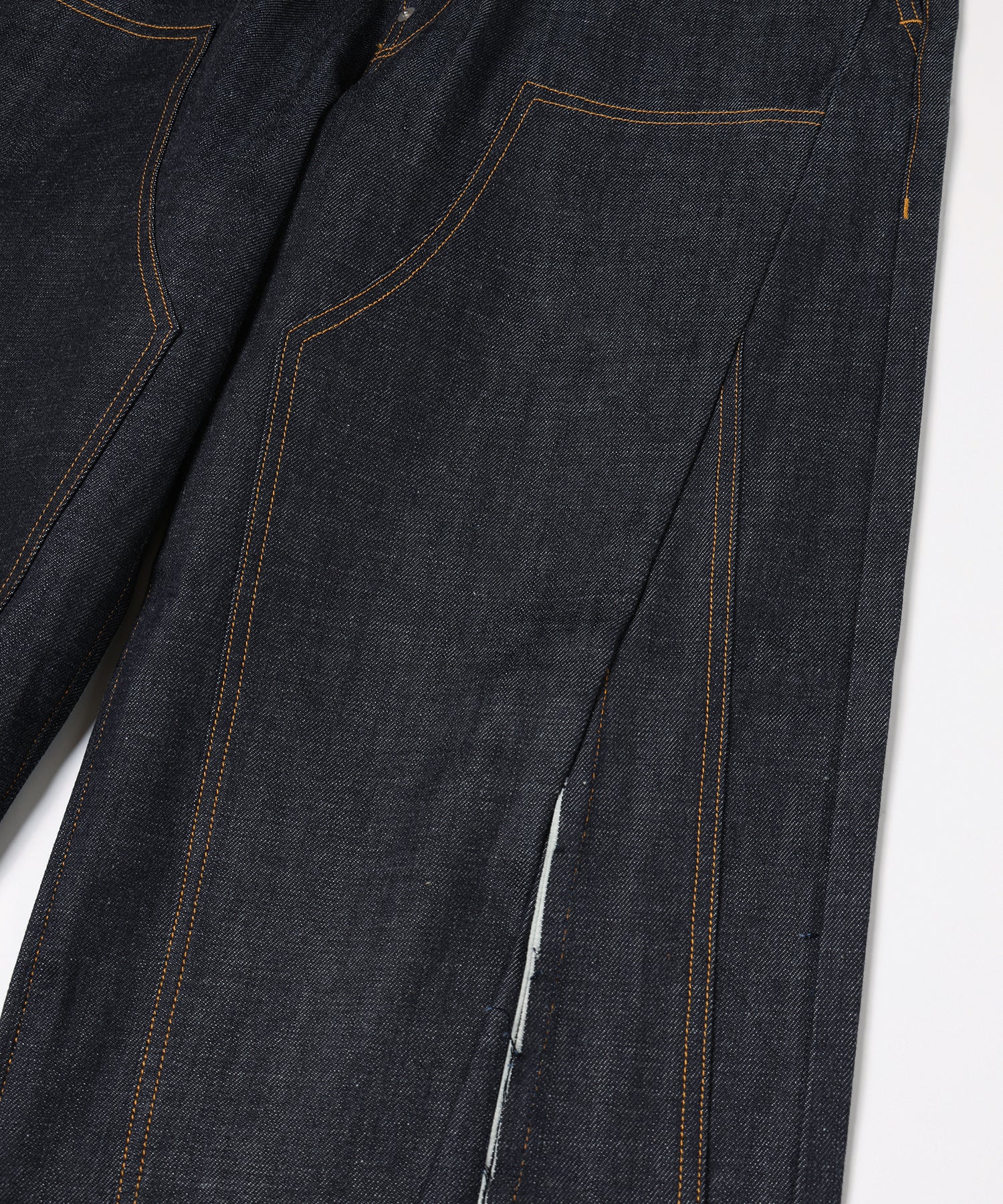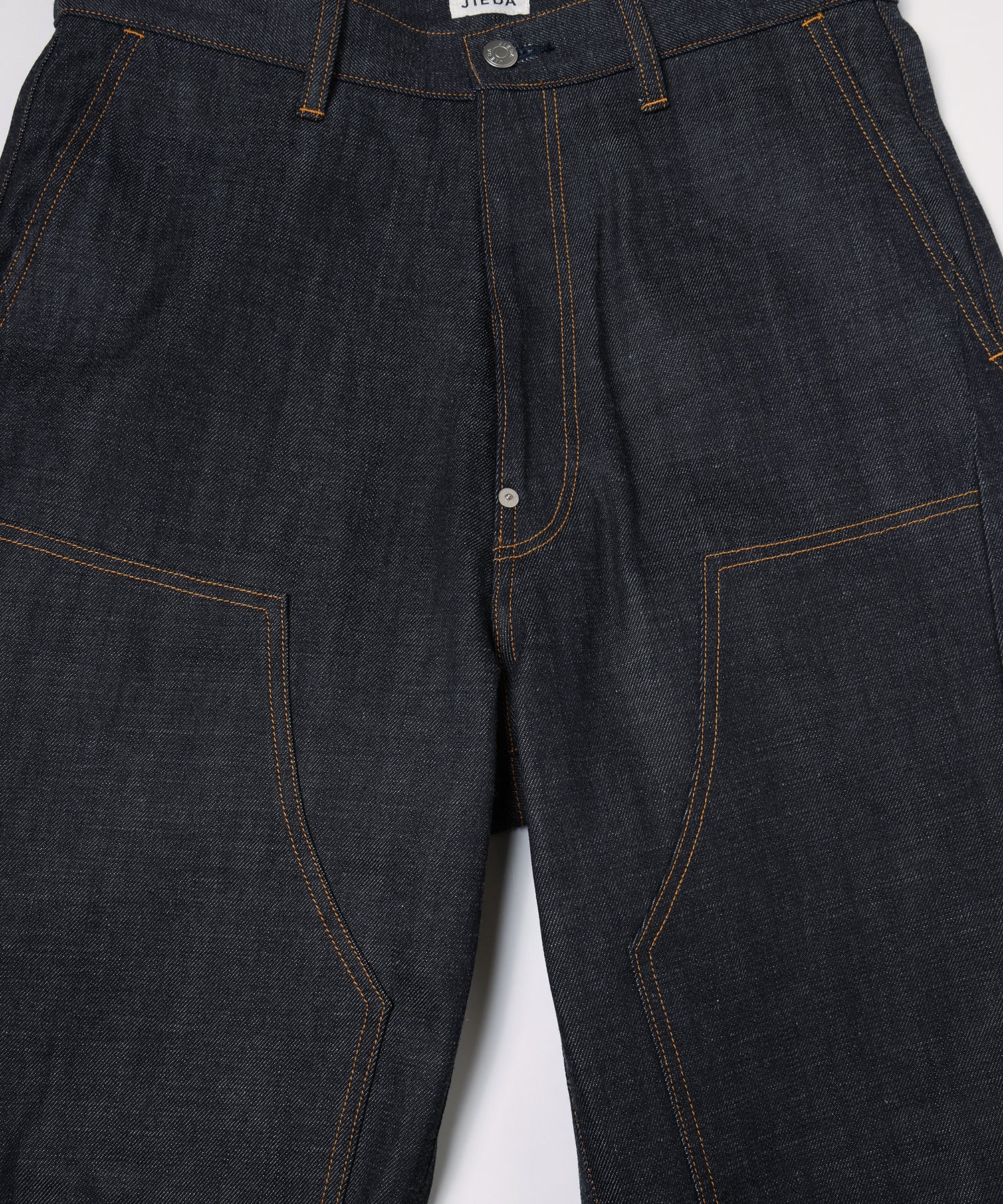 構築的なパターンワークによるカッティングが特徴的な、カットオフ仕様のデニムパンツ。