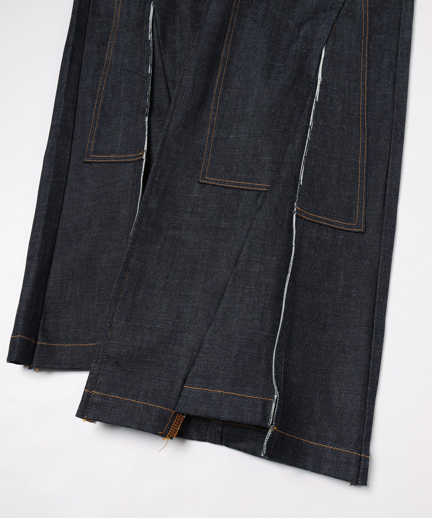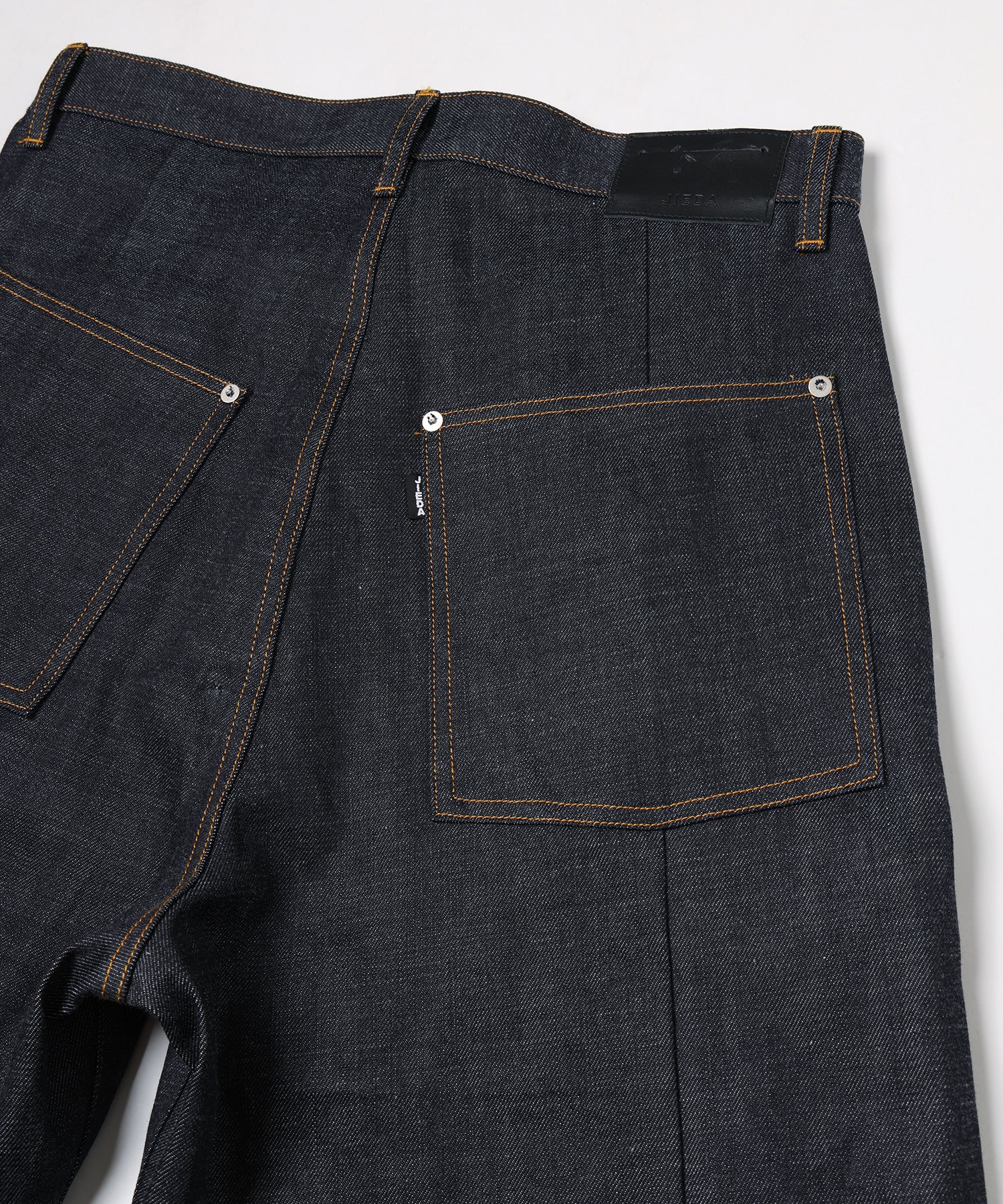 ノンウォッシュのリジットデニムならではのしっかりとしたハリが、構築的なシルエットを美しく保ちます。