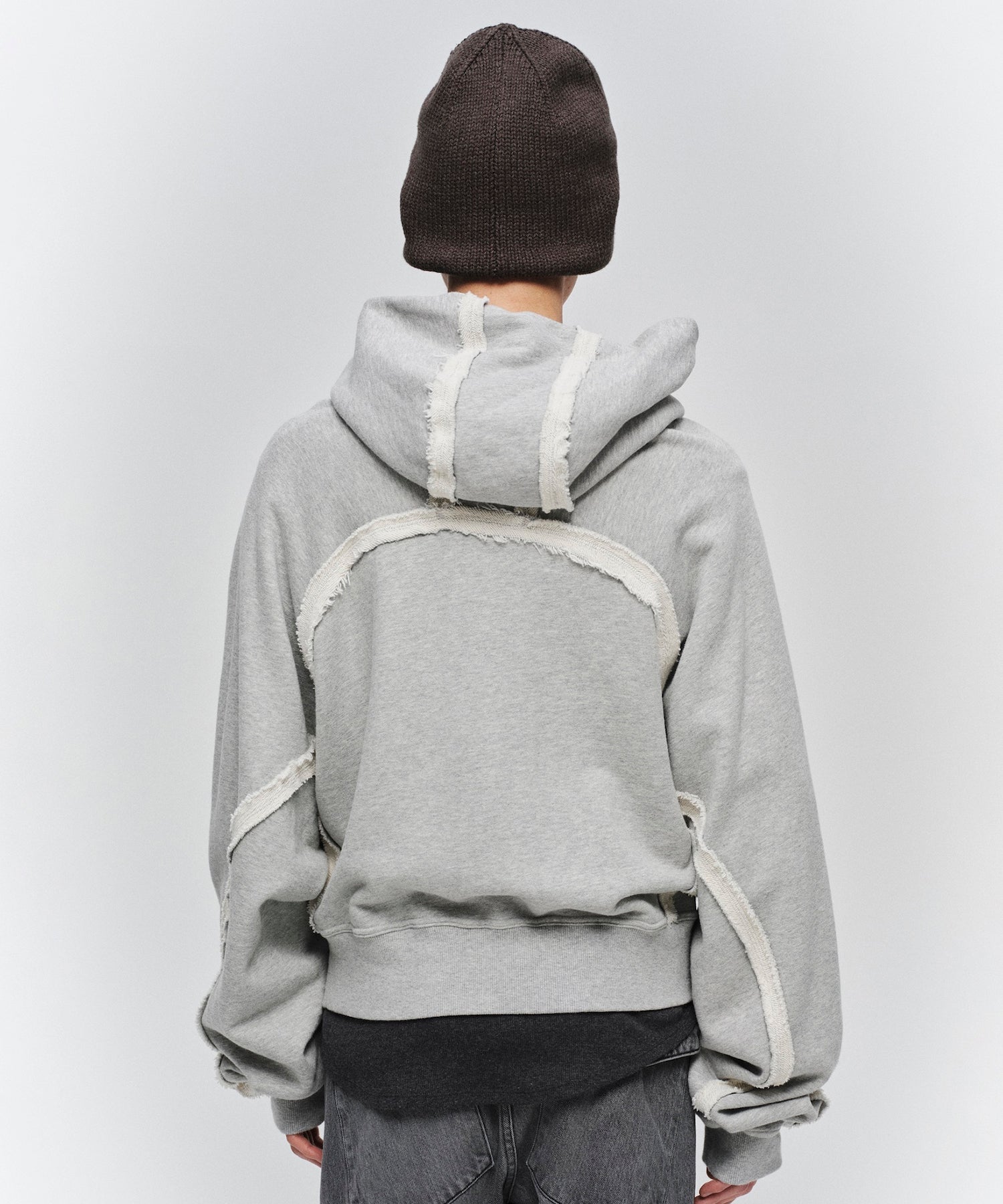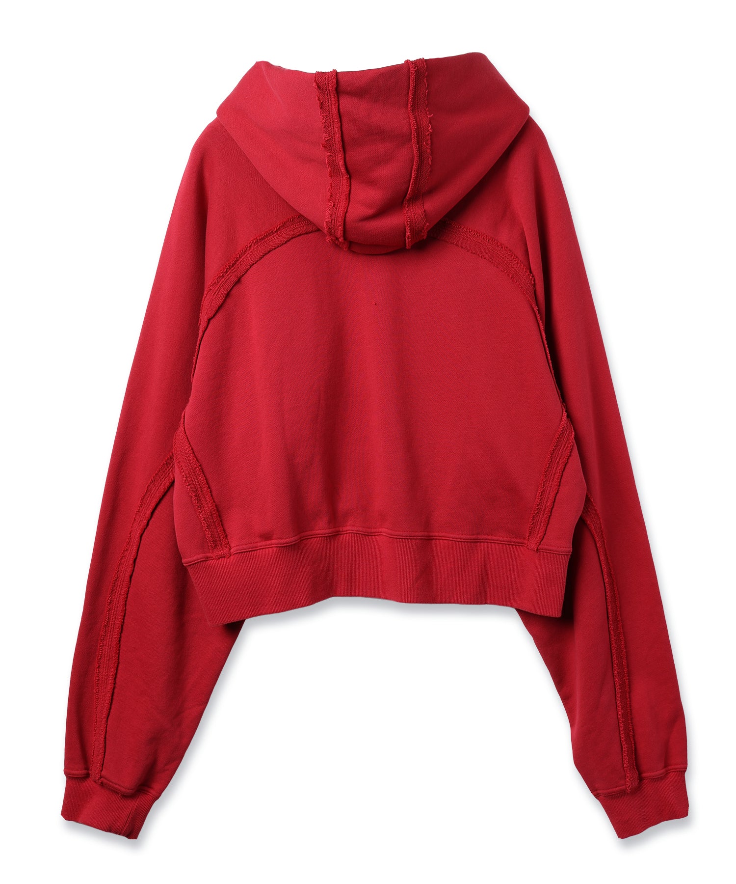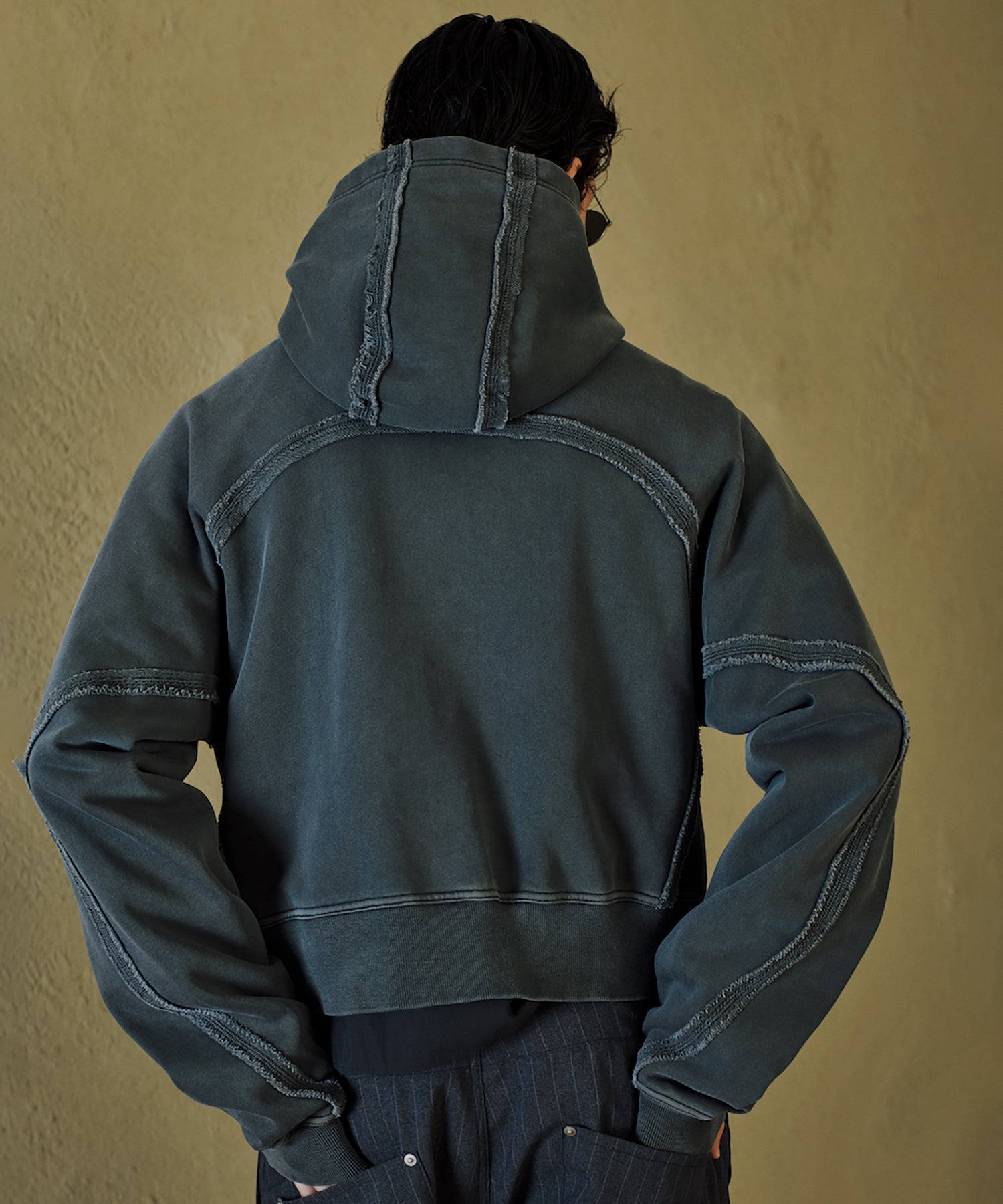 スポーツの文脈を感じさせるラグランスリーブを採用し、大胆に設定したショート丈、控えめなコンパクトフード、太めのアームが特徴です。